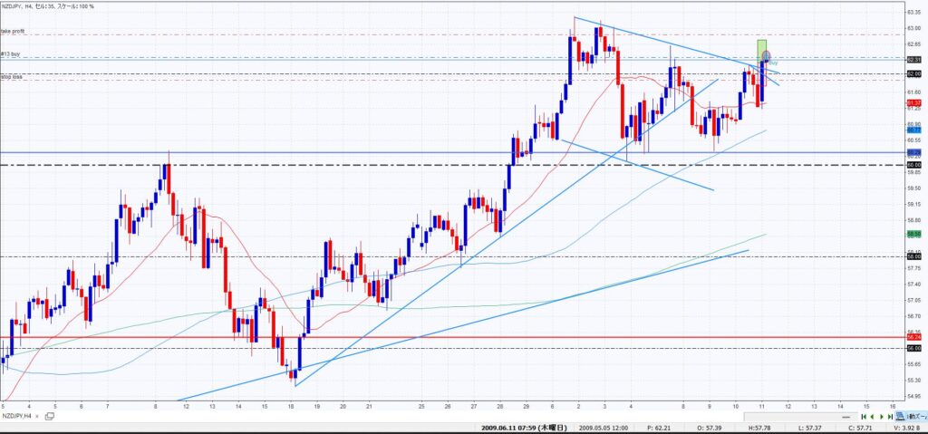 - PFチャネル抜けで試し玉、抜け後リテスト直前高値を試して下髭抱き線形成でロング本玉エントリー