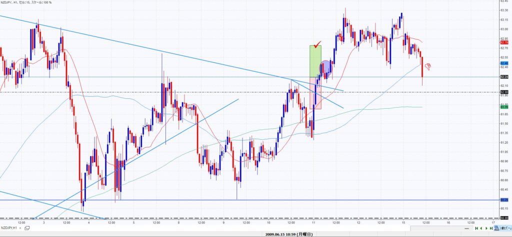 - 上位足での根拠があるのでロングエントリーのタイミングを引き続き探す場面