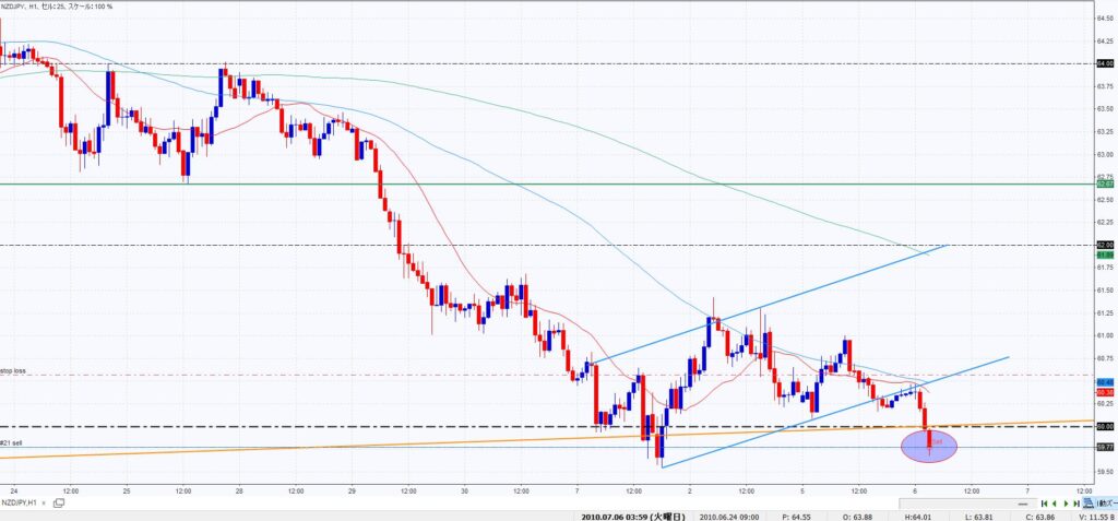 - チャネル向けで下限リテスト、その後の陰線3本でペナントとラウンドナンバー抜けショートエントリー