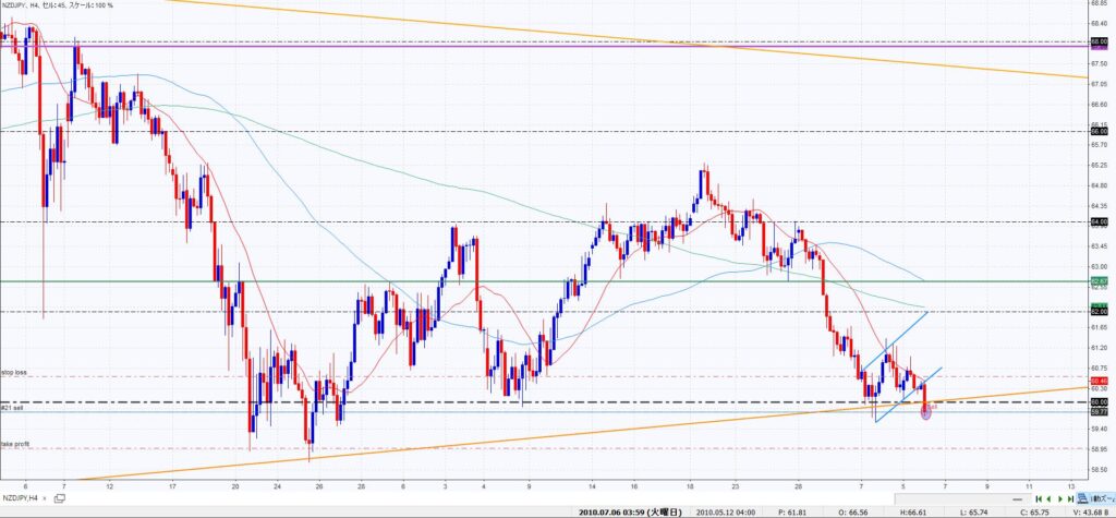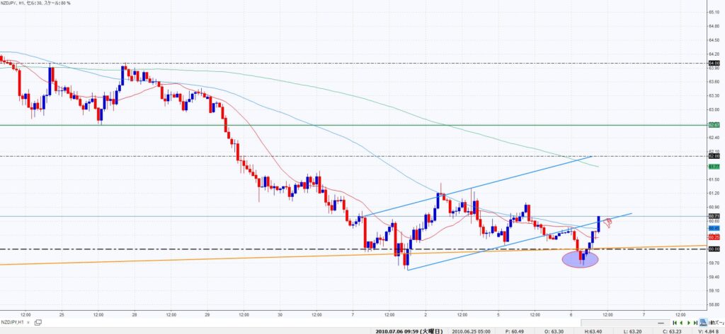 - 下降トレンドから半値戻しのレンジ、ペナントと10円刻みのラウンドナンバーである60円ラインにタッチしたところ