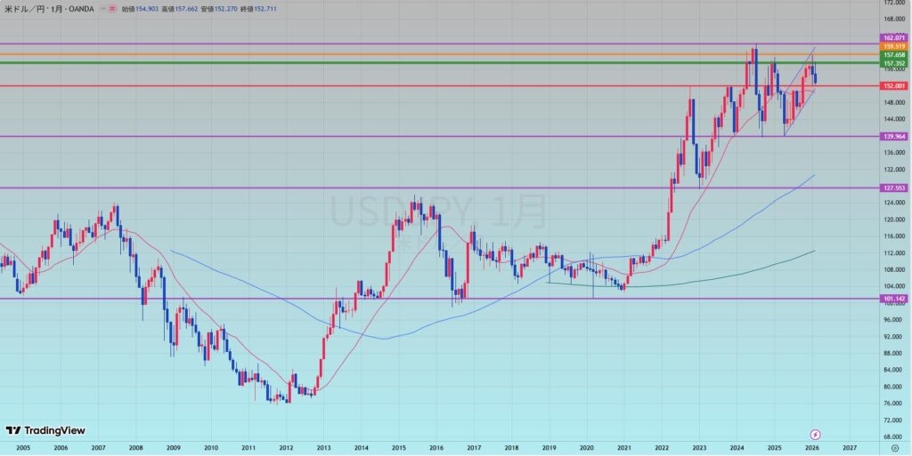 月足の解釈: エリオット波動のカウントに迷いがあるとのことですが、現状は**「上昇の勢いが一服した調整局面」**という認識で間違いありません。130円近辺までの押しは、長期上昇トレンドの「健全な調整」の範囲内であり、その視座は非常に現実的です。