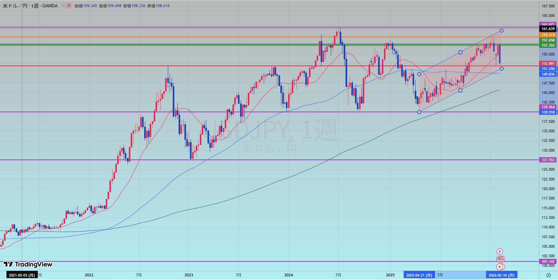 週足のパワーバランス: チャネル内での大陰線出現により、それまでの「買い一辺倒」の空気が完全に破壊されています。仰る通り、140円付近までの下落余地は十分にあり、**「上がる時はじわじわ、落ちる時は一気に」**という相場の本質(スノーボール効果)を捉えた鋭い考察です。