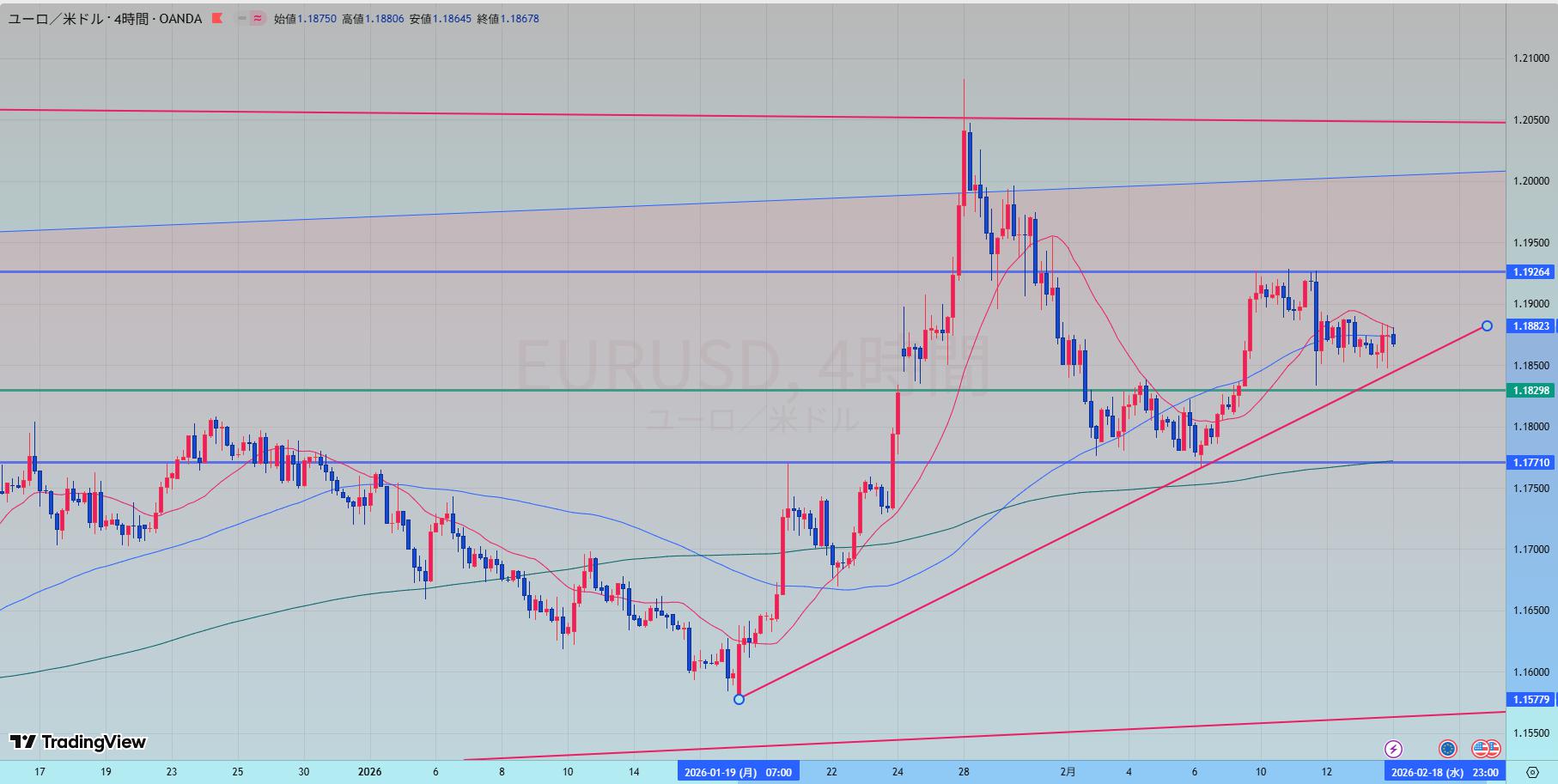現在は**「大きな上昇トレンドの中の、重要な調整局面」**です。 1.1926という「壁」の存在を尊重し、短期的な売りで利益を抜くか、あるいは十分な押し目(1.1830〜1.1770エリア)でのプライスアクションを確認してから再度ロングを仕込むのが、再現性の高い戦略と言えます。