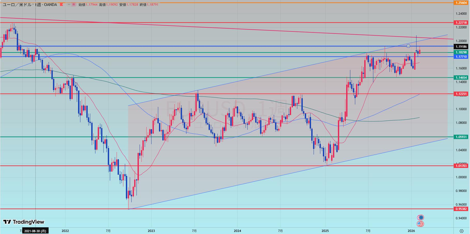 週足(w.jpg): 上昇チャネル内での推移。現在はチャネル上限および過去の主要な水平線(1.1926付近)に到達し、**「買いのゴール(一旦の達成感)」**が出やすい局面です。