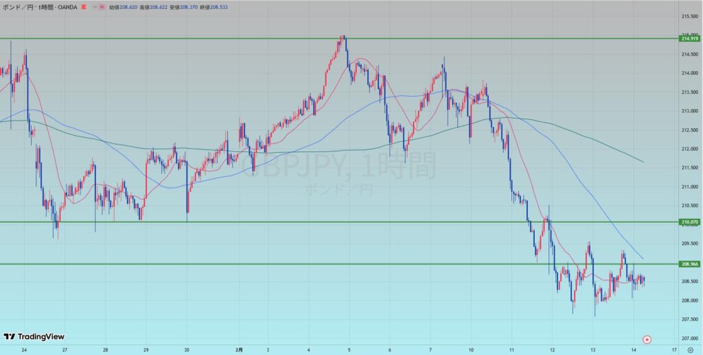 深掘り: PF(ポールフラッグ)形成中とのことですが、現在は安値圏での停滞に見えます。ここからもう一度208.966付近までの「リテスト(戻り)」を待てるかどうかが、次の一手の質を決めます。