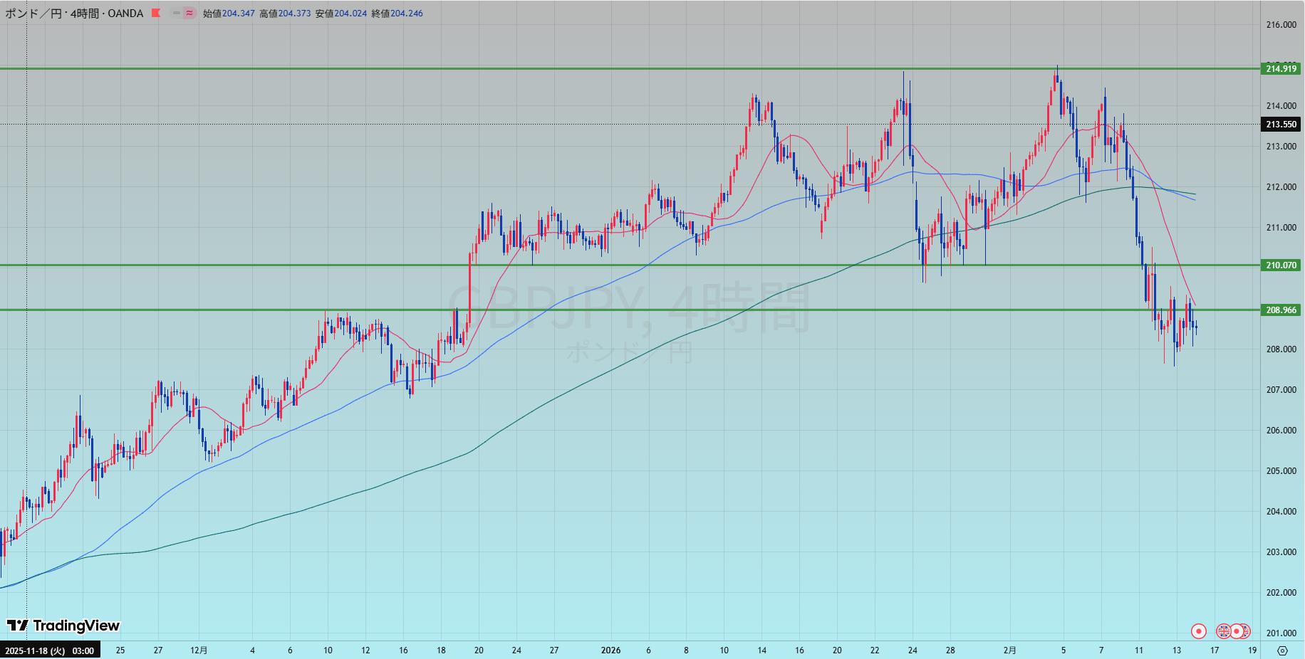 【次の一手への助言】 今は「買い」を考える時期ではありません。H1・H4レベルで「戻り」を確認し、209.00〜210.00付近でレジスタンスされるようなら、週足レベルの深押しを狙ったショートのセットアップを検討してみてはいかがでしょうか?