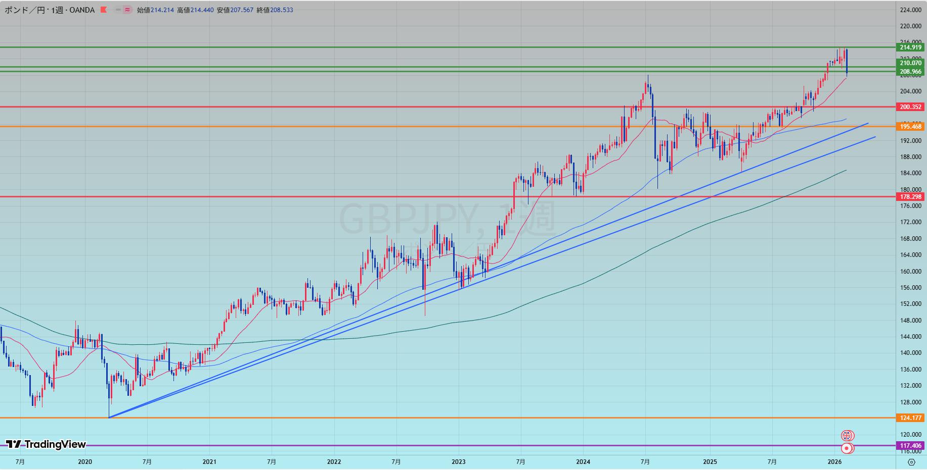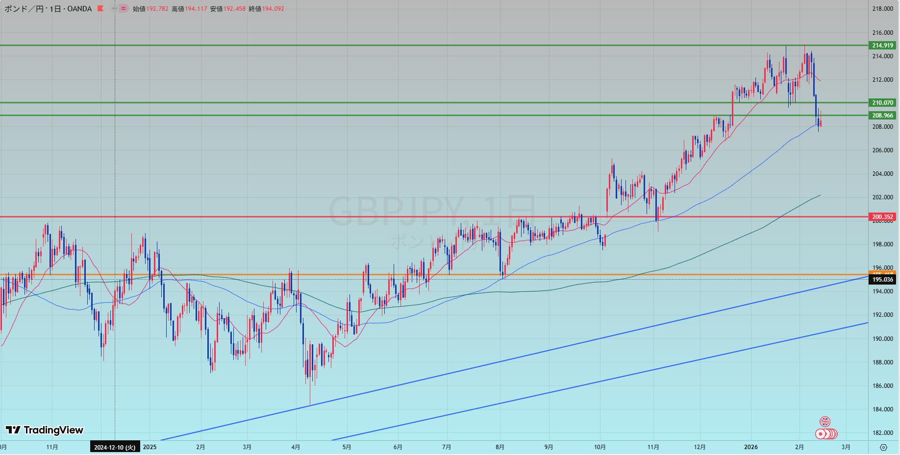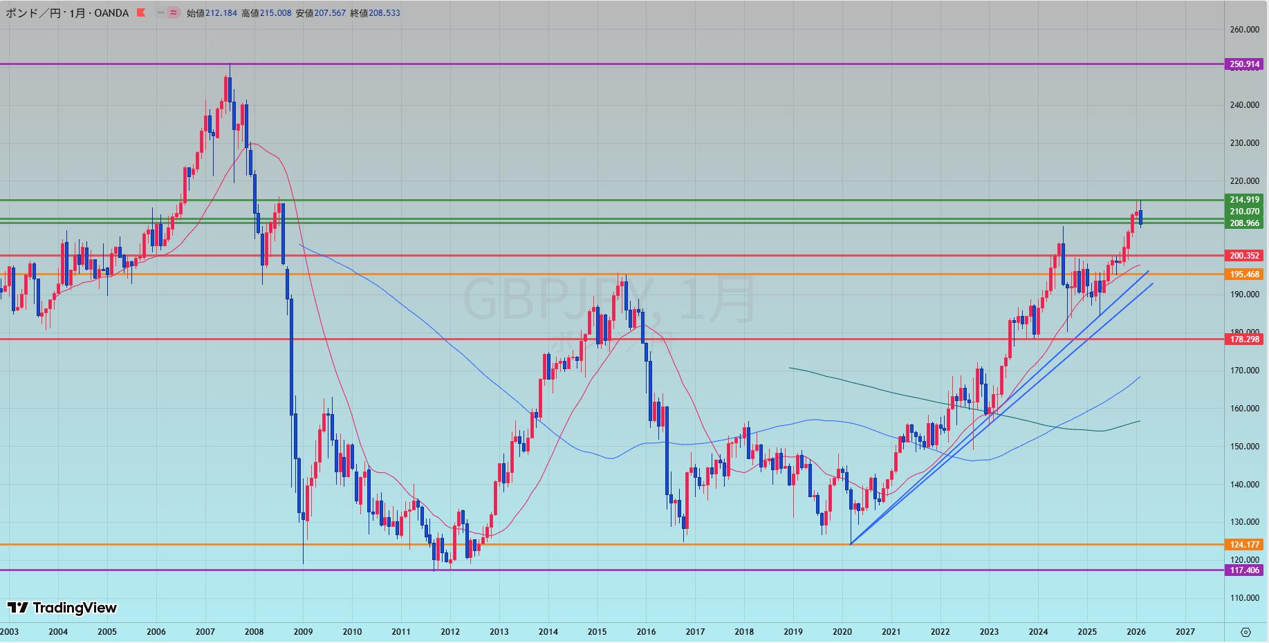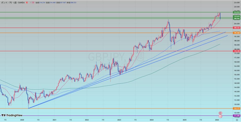 円安バイアスの排除: GBPJPYはポンドの強さだけでなく、円の独歩安で上がってきた側面があります。月足の「250」という数字に引っ張られすぎず、現在の「日足レベルのダウ崩れ」という事実を最優先にすべきです。