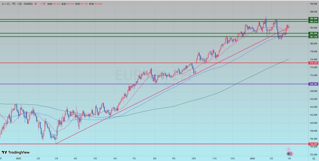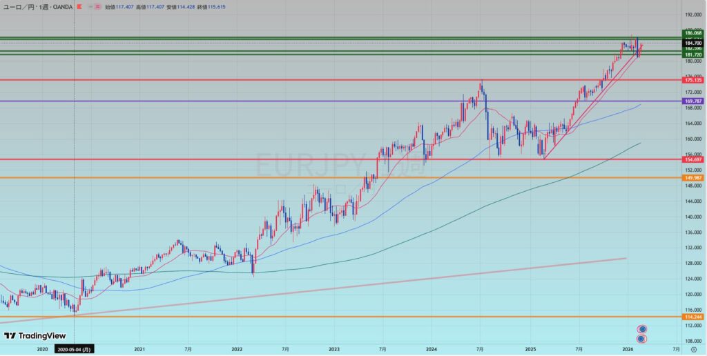 リスク指摘: 181.70付近の緑水平線が極めて強力なサポートとして機能しており、ここを割るまでは週足レベルでの本格的な調整(175円台へ)は始まりません。
