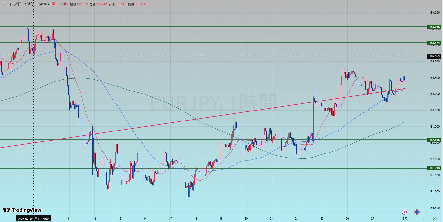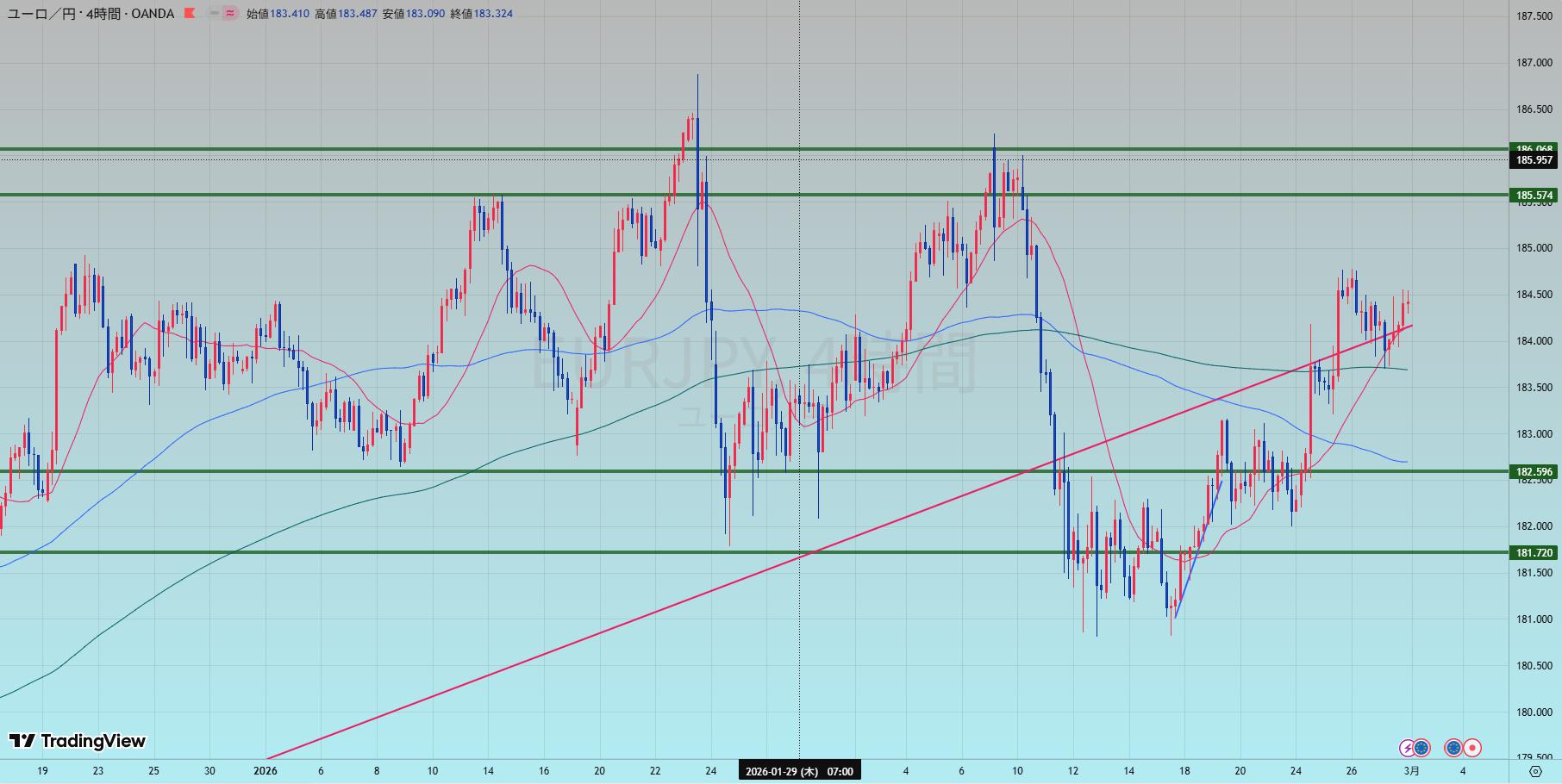 分析評価: 局所的には上昇トレンドですが、上位足のレジスタンス(185.60〜186.00)の直下であることを忘れてはいけません。