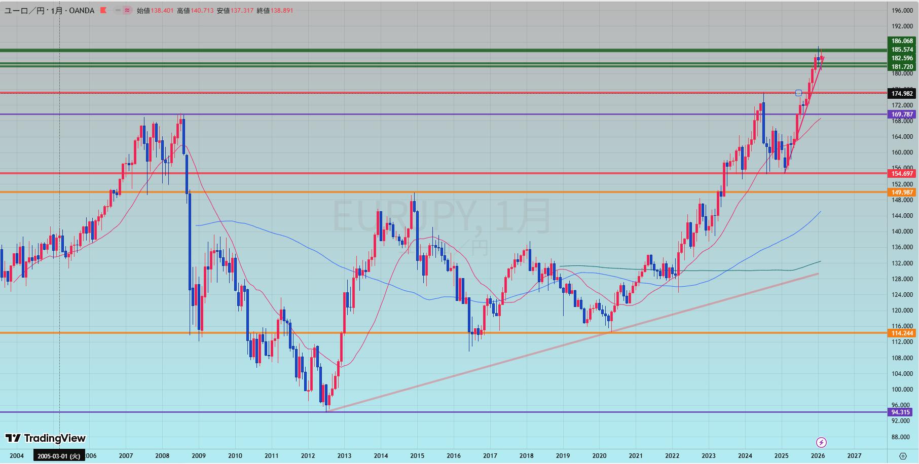 分析評価: 「乖離による調整」の視点は非常に妥当です。2012年安値(94円付近)から始まったサイクルを考えると、現在は**第5波の最終局面(エクステンション)**である可能性を否定できません。