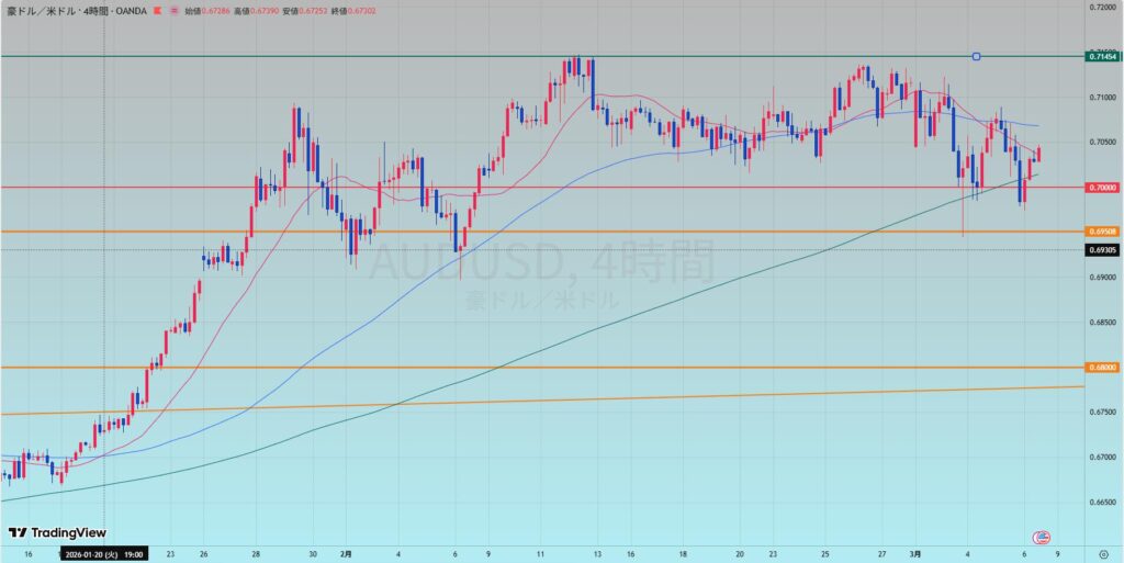 批判的視点: 「上方向に行くなら付いていきたい」というバイアスが強い。現在のH4チャートでは高値を切り下げており、短期的にはディセンディング・トライアングルに近い形状。0.700(赤線)を明確に下抜けた場合、日足の調整が深く入るシナリオを排除しすぎている。