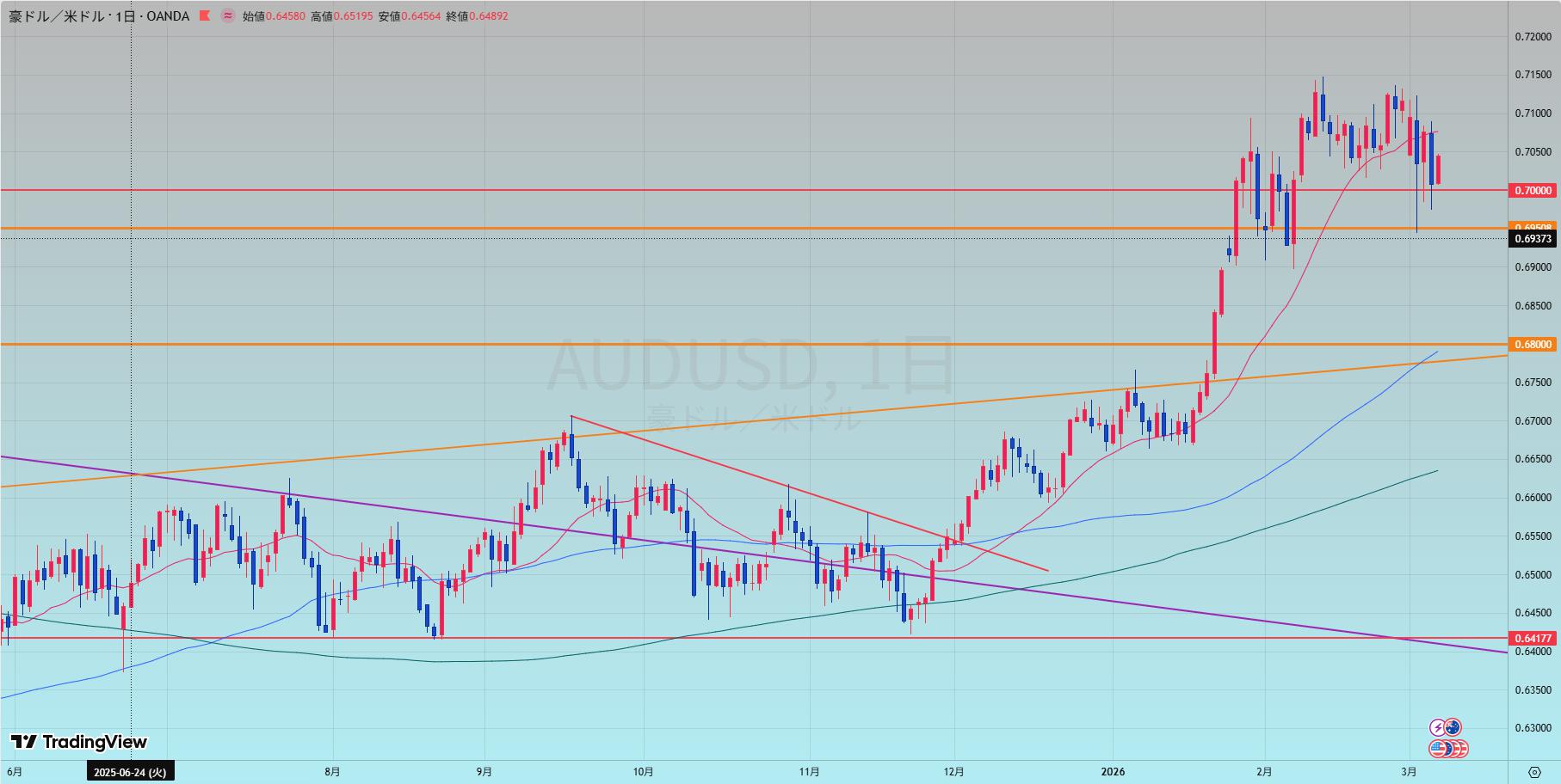静観・ショートへの切り替え: 0.700を明確に割り込み、レジサポ逆転が確認された場合は、日足MA20付近(0.685-0.690)までの調整ショートを検討すべき局面。