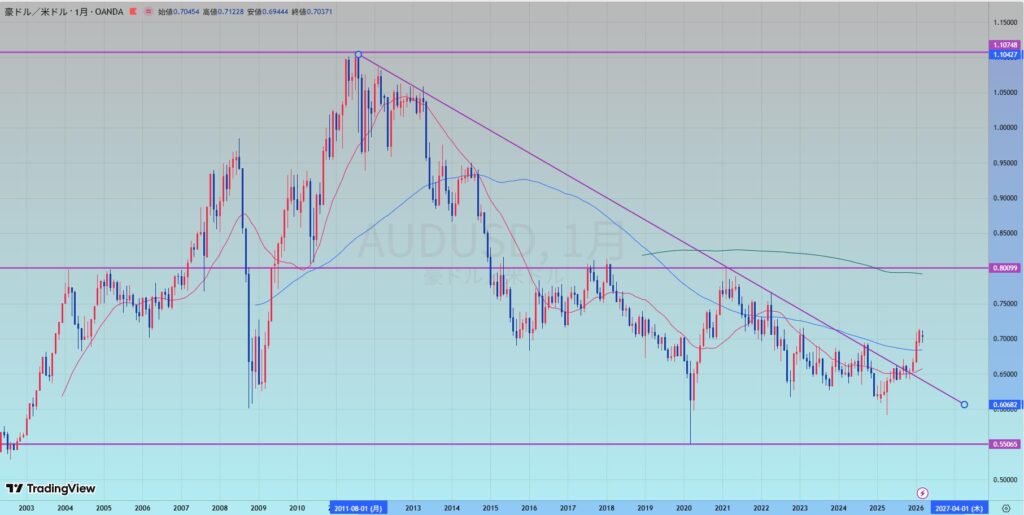 分析評価: エリオット波動の解釈(2011年始点)は妥当。現在は長期下降トレンドの終焉か、あるいは巨大な調整局面の出口にある。0.800付近までの戻り余地(MA乖離埋め)の指摘は客観的。