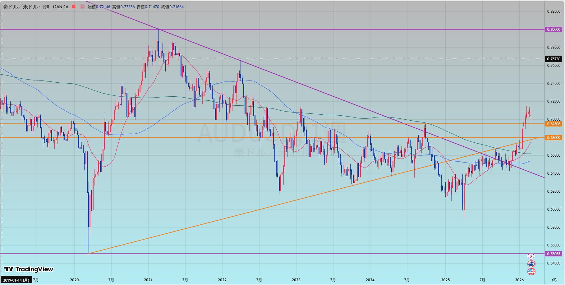 批判的視点: 「リテストしてくれる展開が楽」という希望的観測は危険。強いトレンド時はリテストなしでMA乖離を無視して突き進む。逆に、水平線(0.700)で揉み合う時間が長すぎると、週足レベルでの「上ヒゲ」形成となり、再度ペナント内への回帰(フェイク)となる懸念がある。