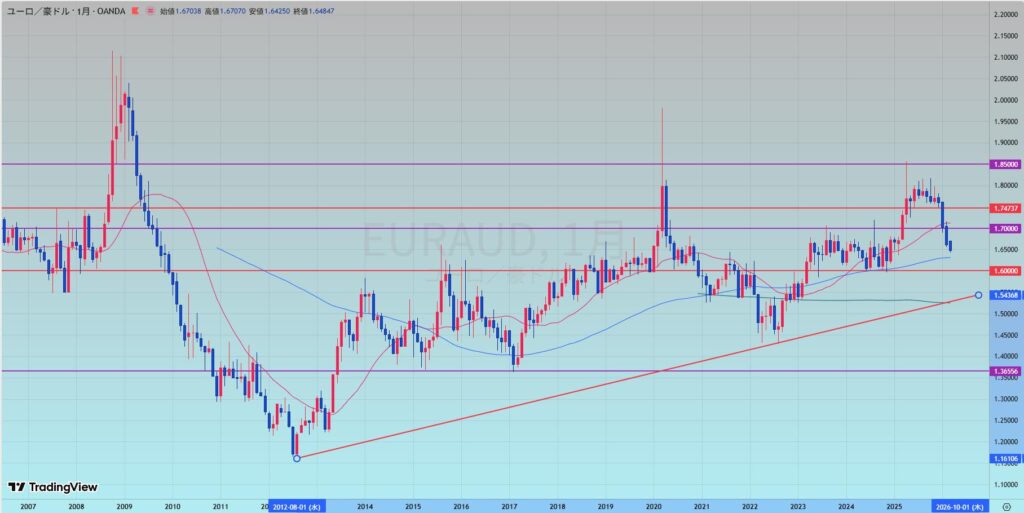 リスク指摘: 月足レベルの20MA(赤)を明確に割り込んでおり、単なる「方向感なし」以上に、月足レベルでの調整売り圧力が強まっている事実に留意。$1.648$付近の直近安値を割ると、次の節目は$1.600$まで真空地帯に近い。