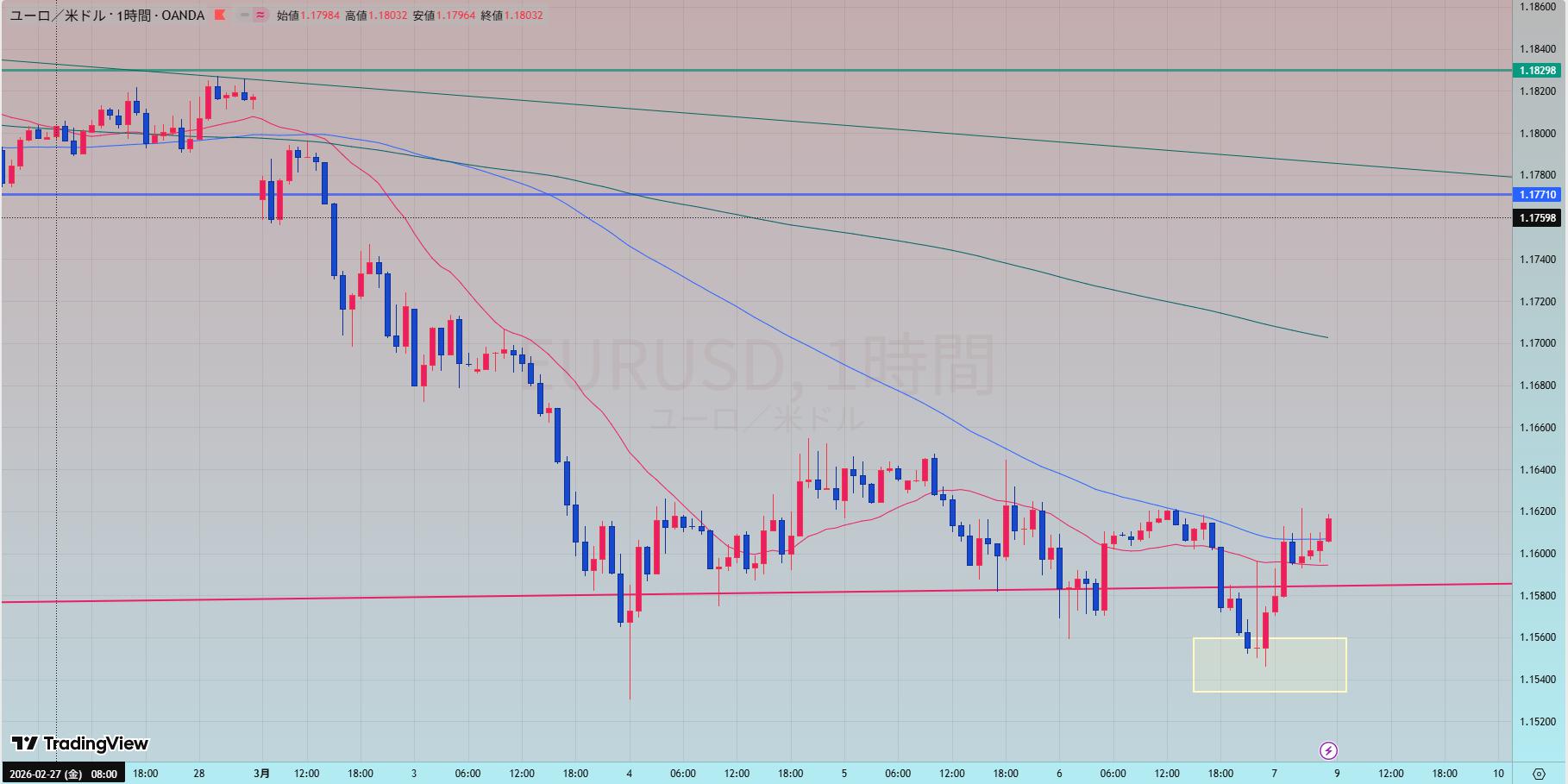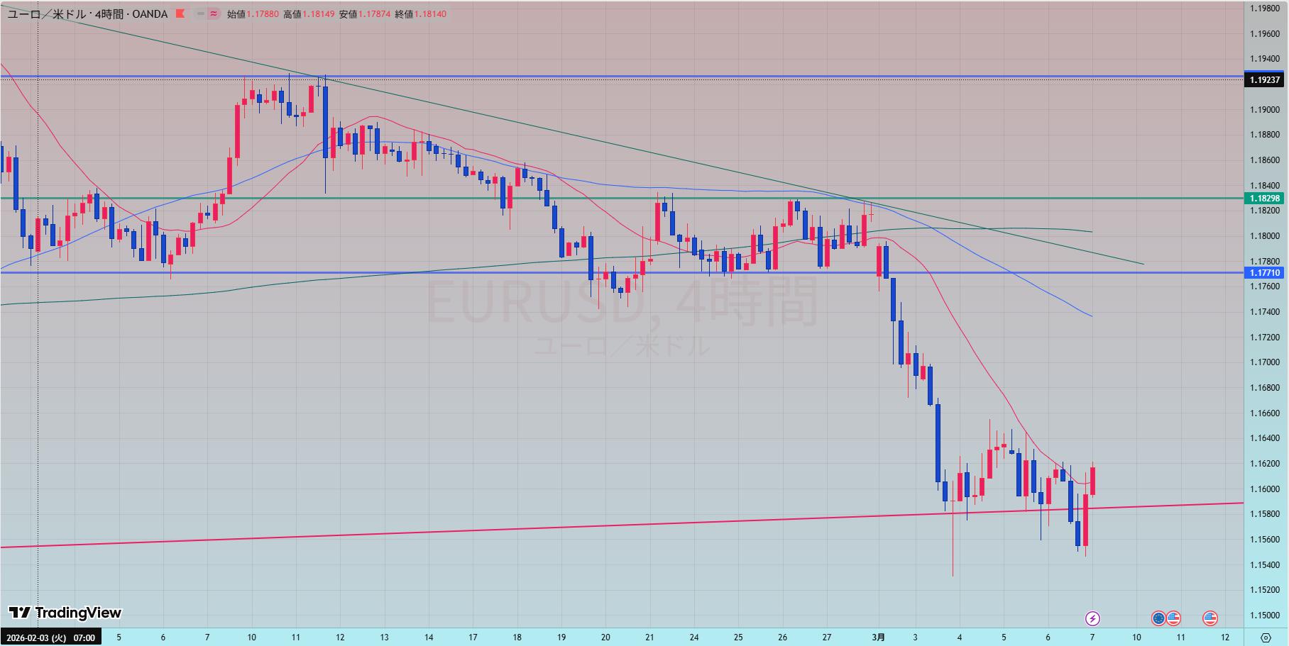 • ショートの場合: H4確定足でチャネルを完全に実体で抜け、かつ1.1500を明確に下抜けた後の「戻り」を確認。