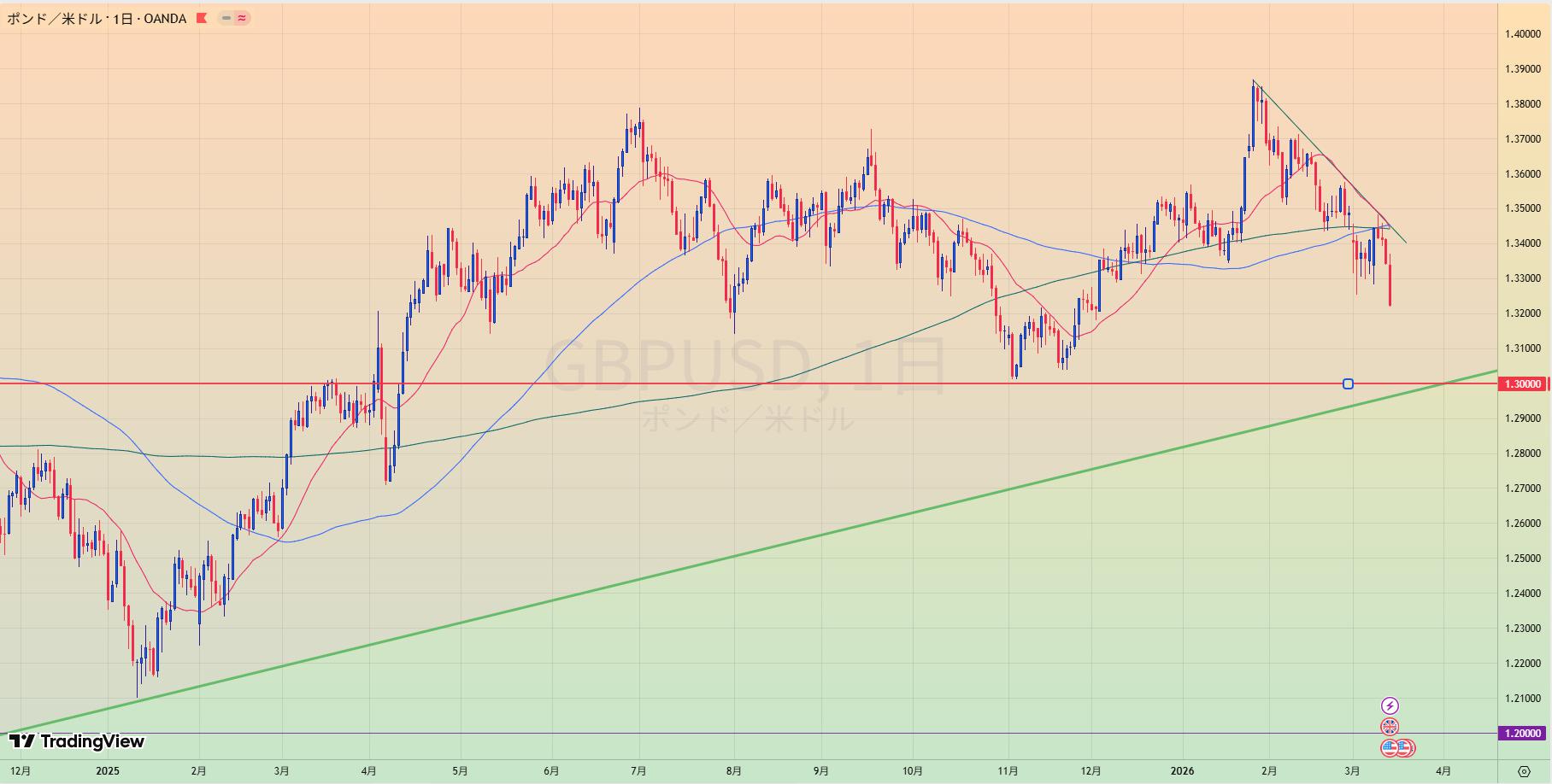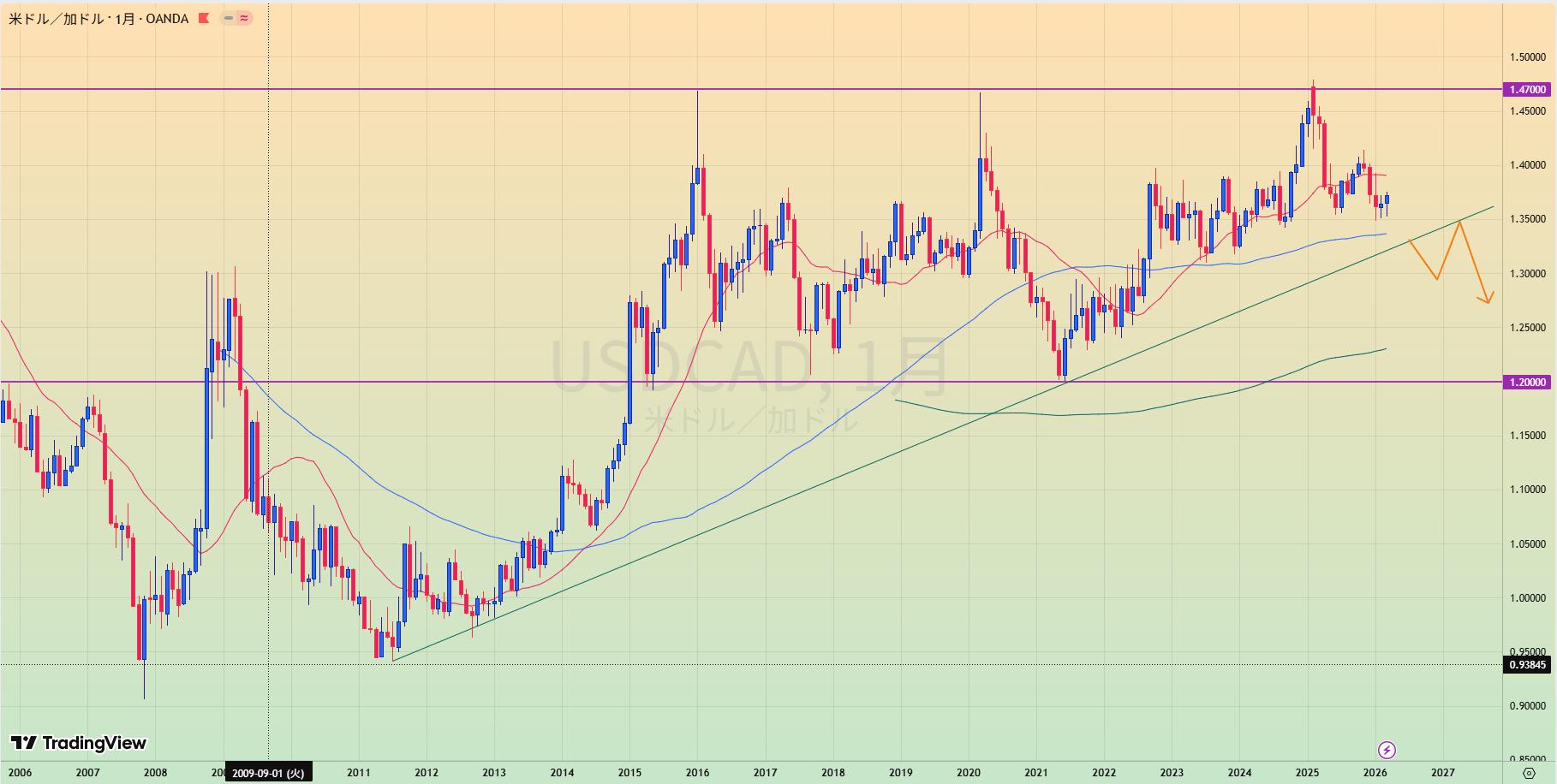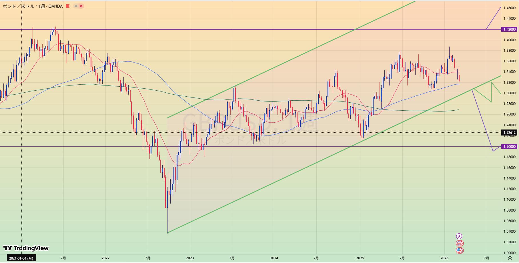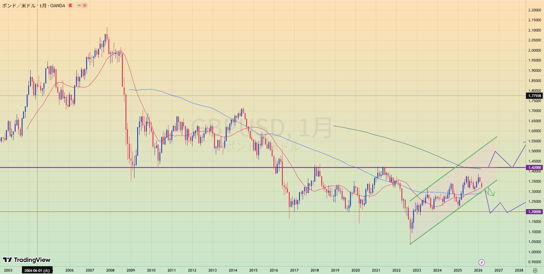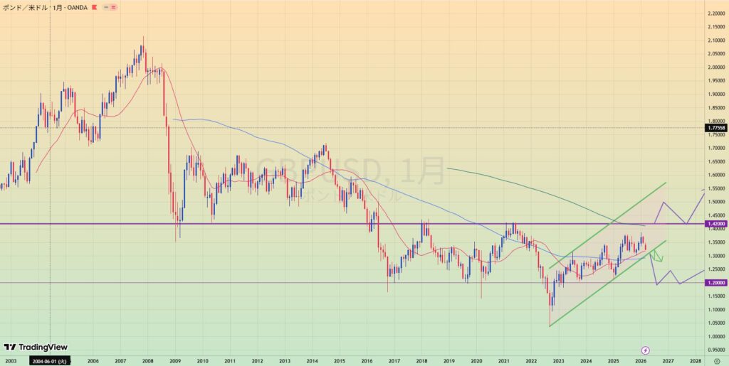 - MA200乖離もあり、緑トレンドライン下抜けなら1.20まで値幅十分でショートもあり得る。