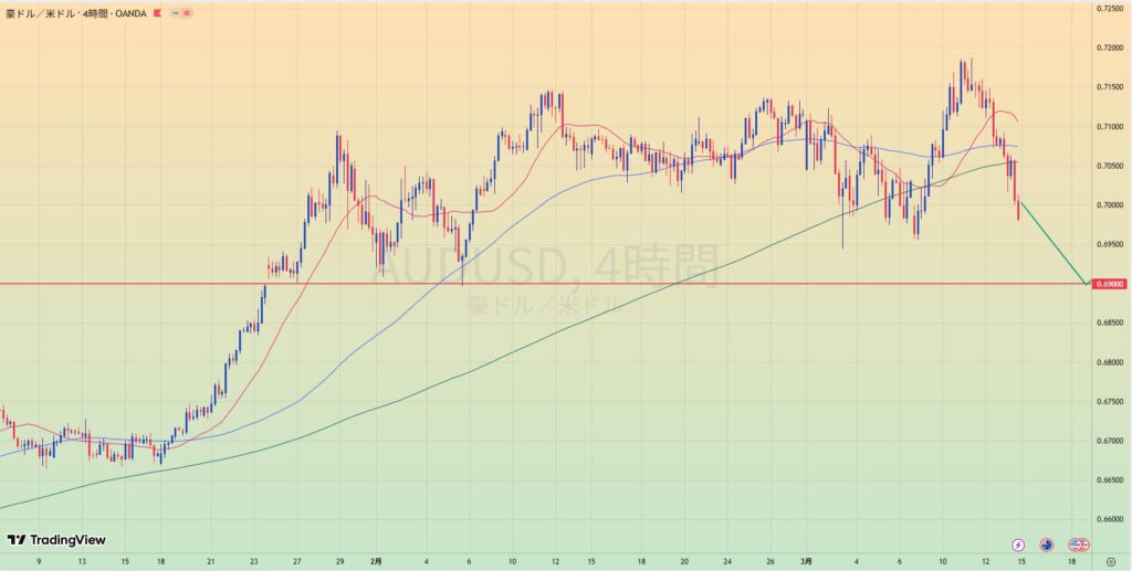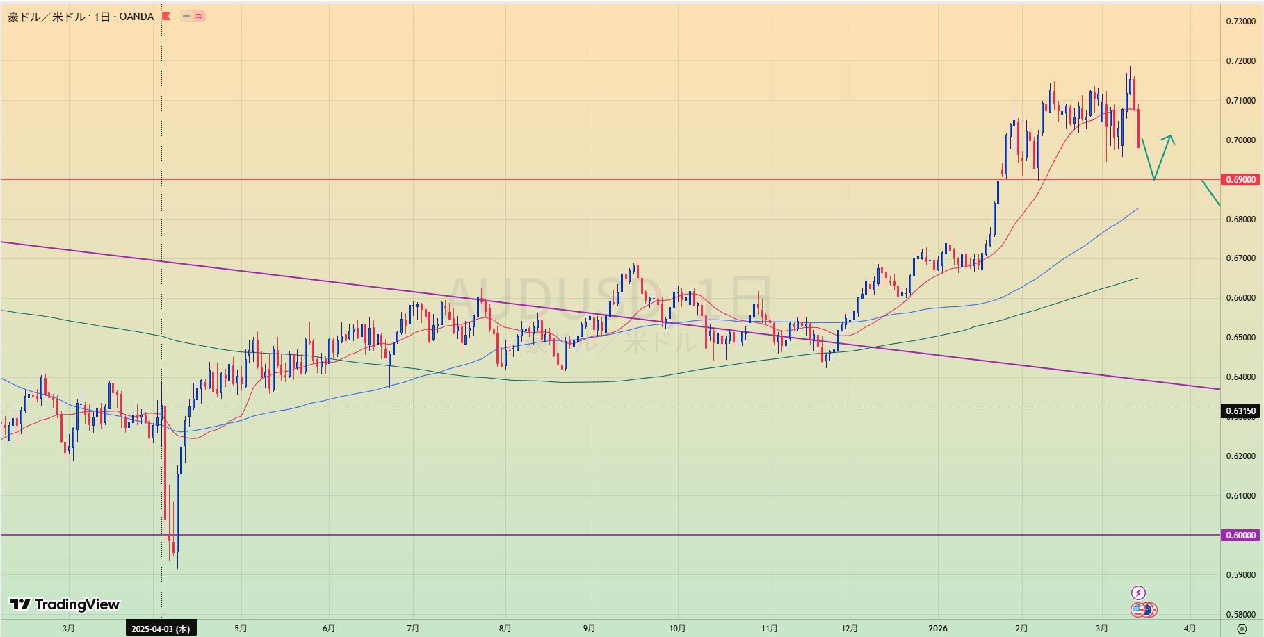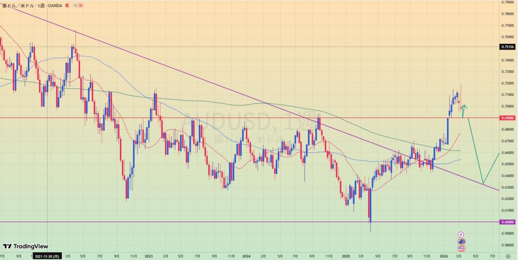 - 長期レジラインを抜け、0.69の水平線でレジサポになりリテスト中。
