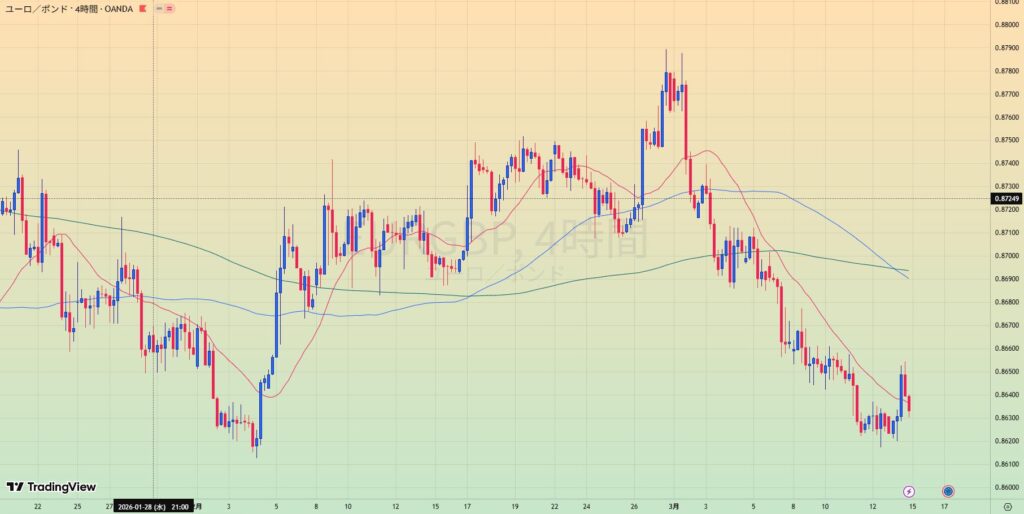 • 4Hレベルでは下降トレンド形成MAも緩やかな下降フォーメーション