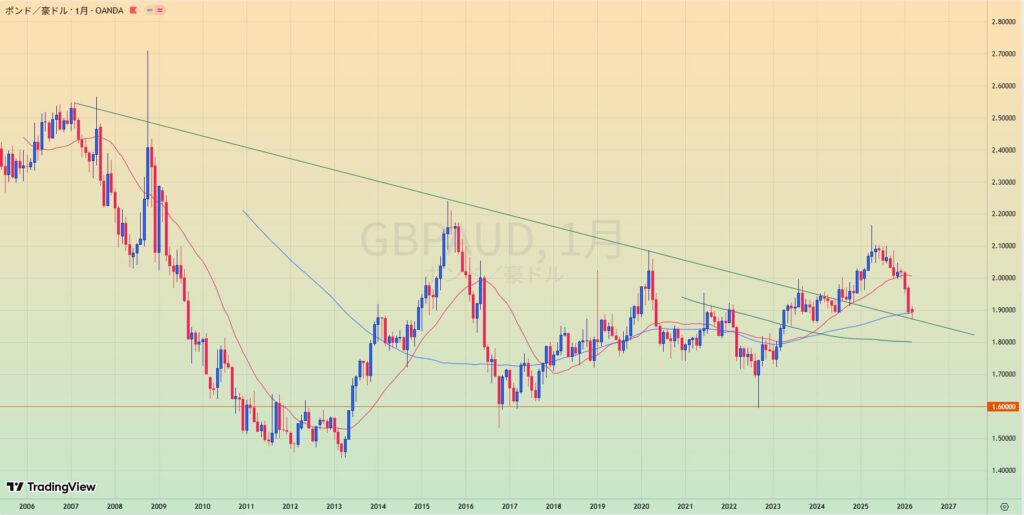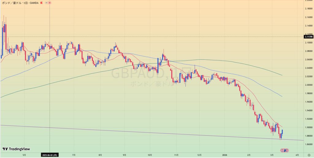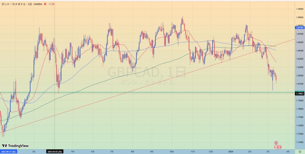 • 上昇トレンド中も、赤サポライン割れで1.80水平線を試しているところ。