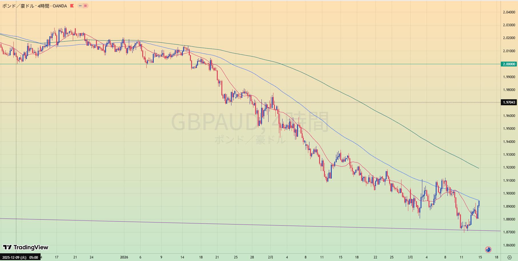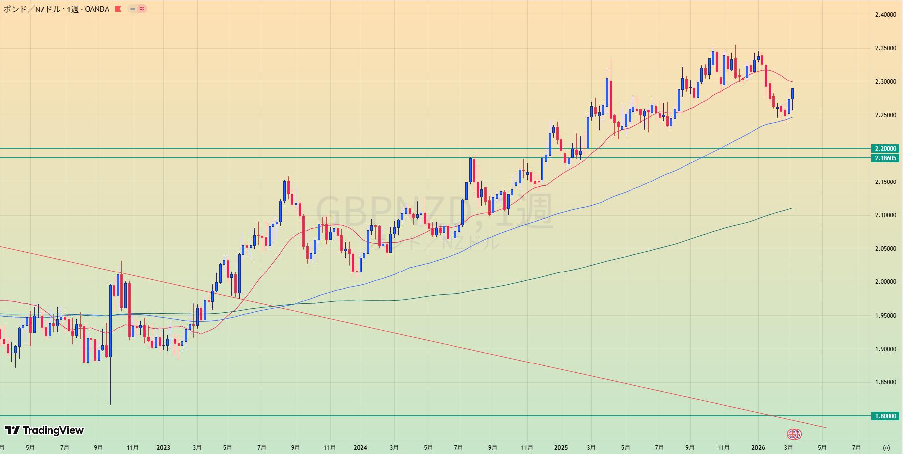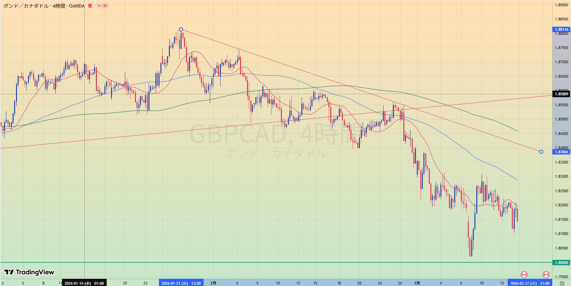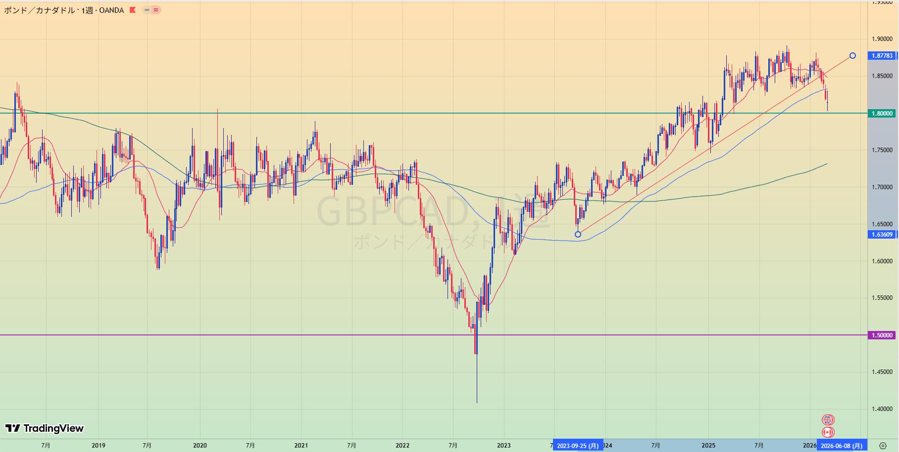 • 上昇トレンド中も、赤サポライン割れで1.80水平線を試しているところ。