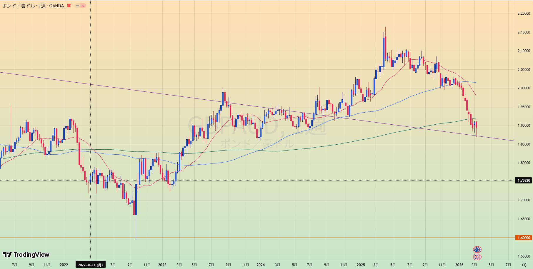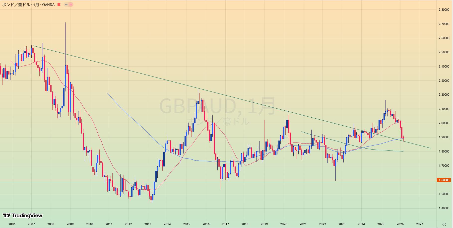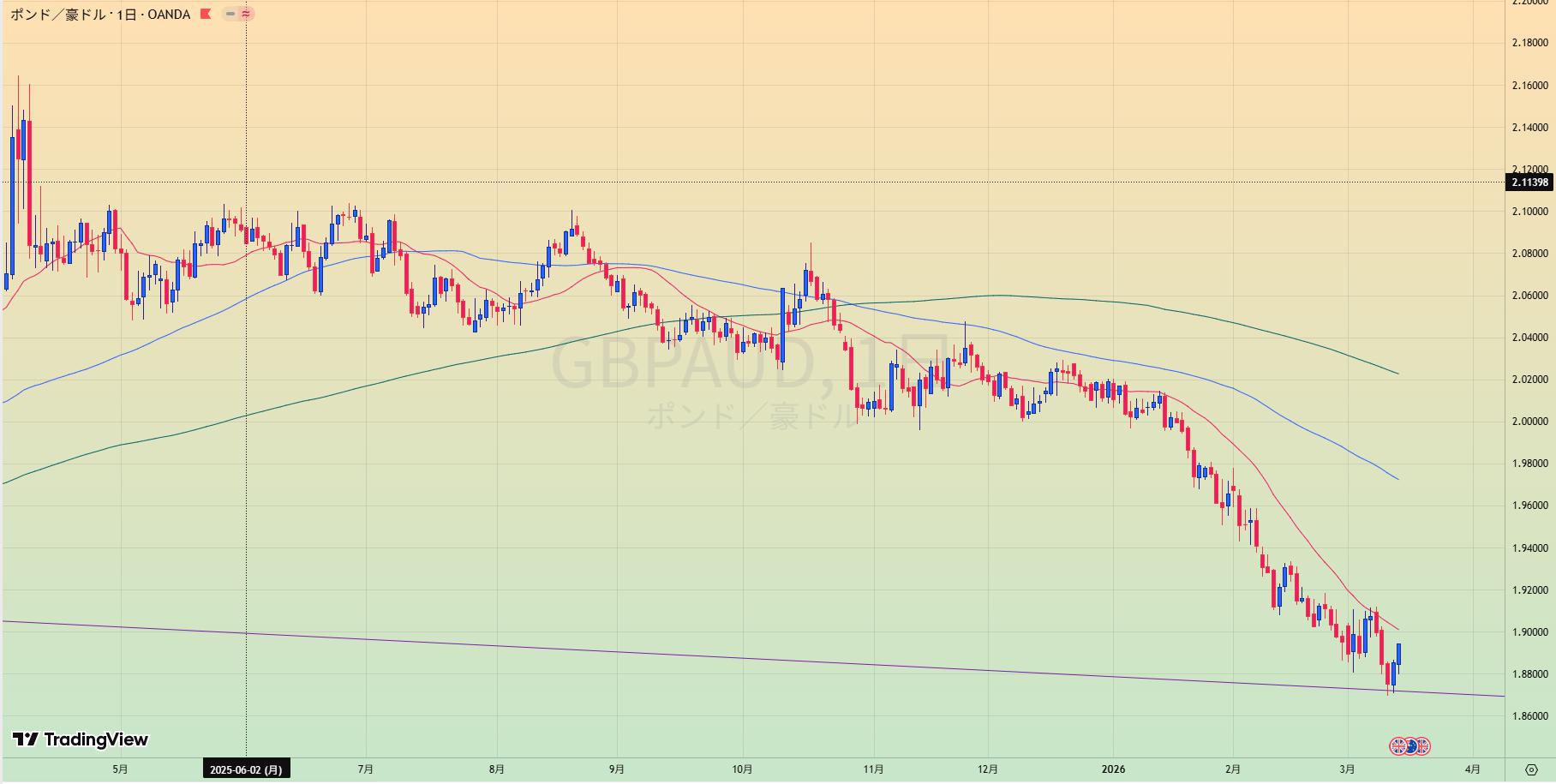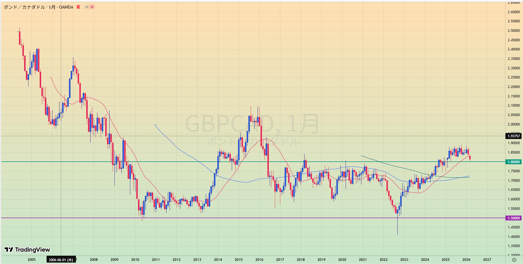 • 上昇トレンド中も、赤サポライン割れで1.80水平線を試しているところ。