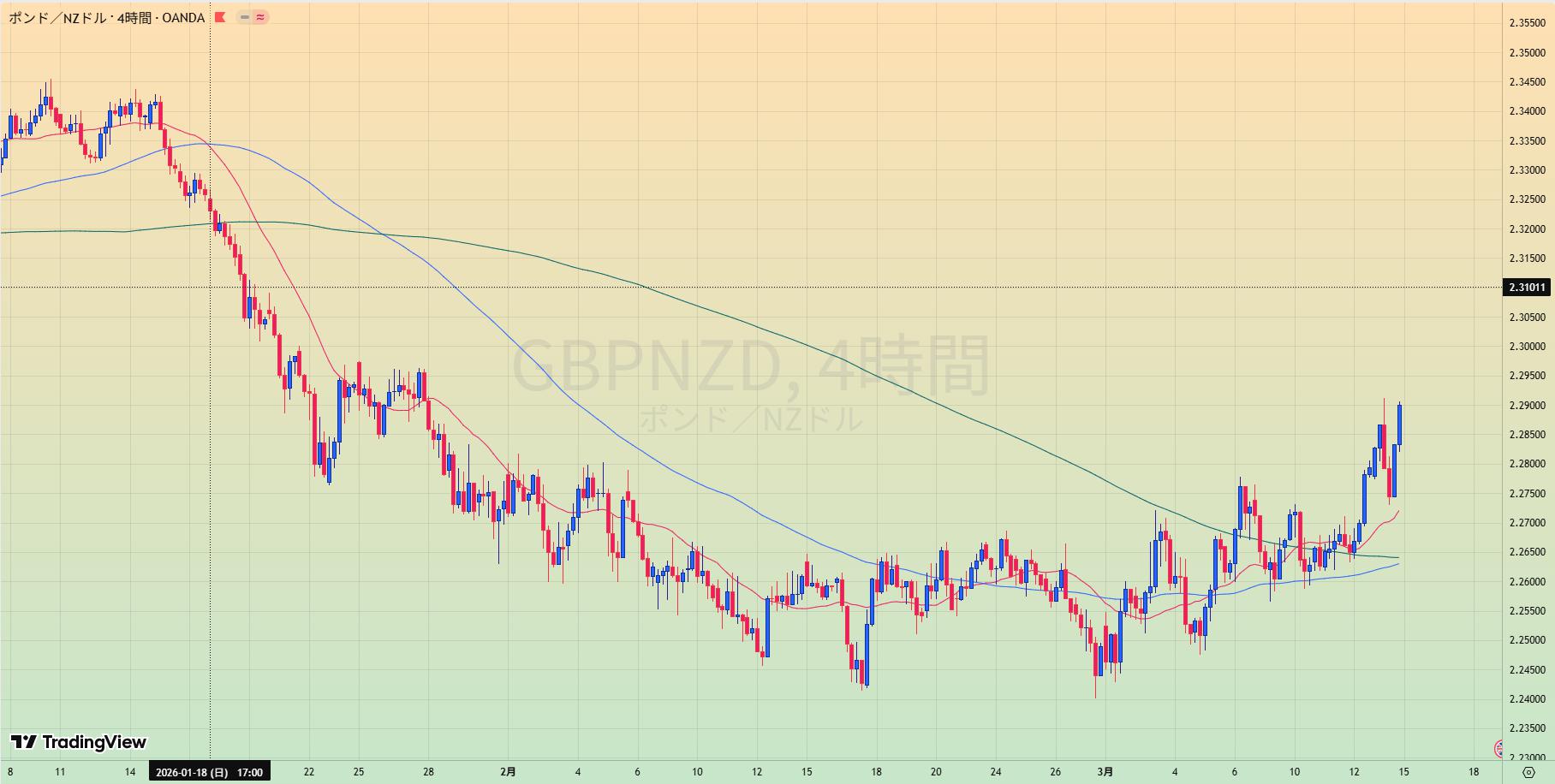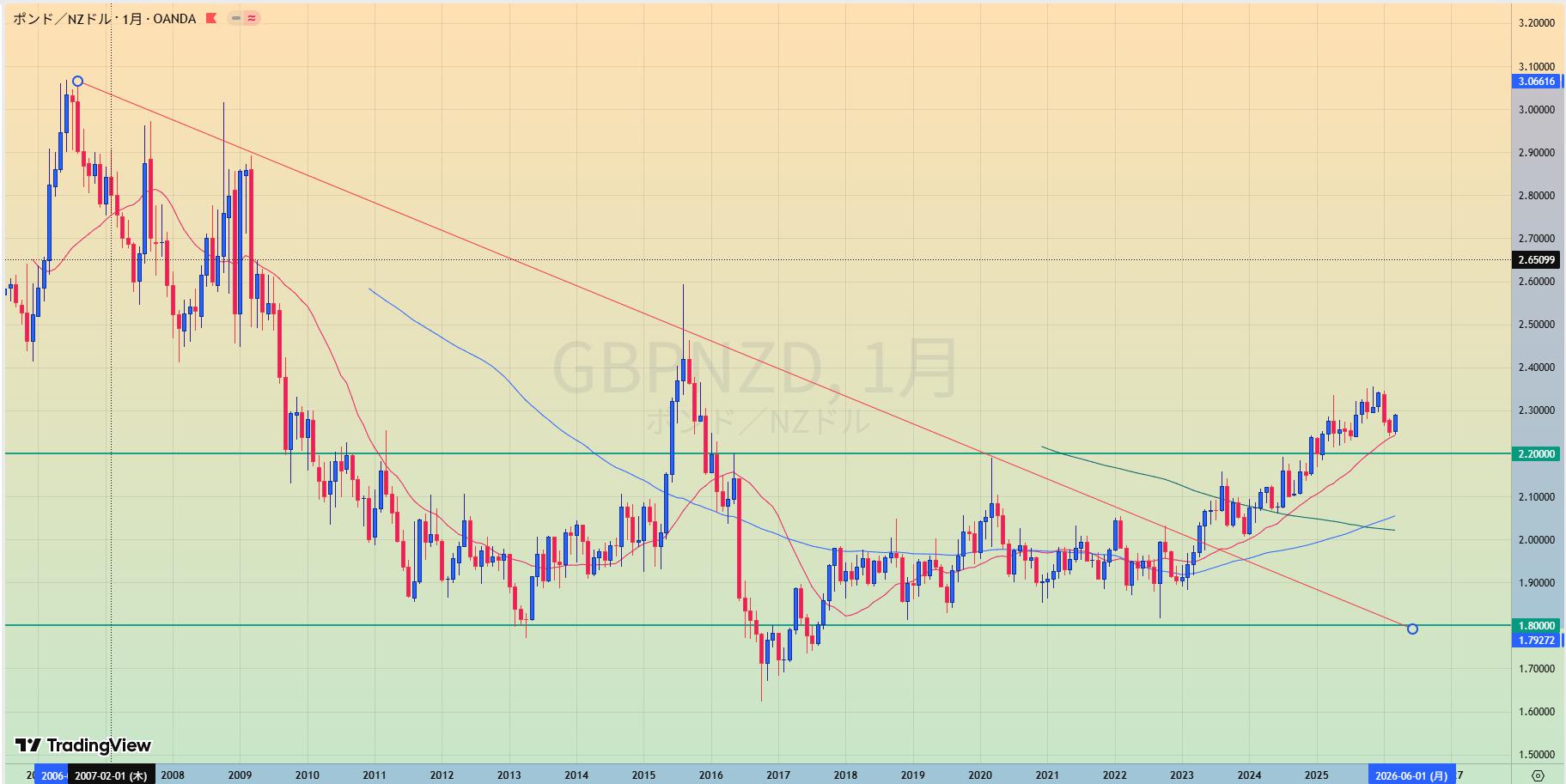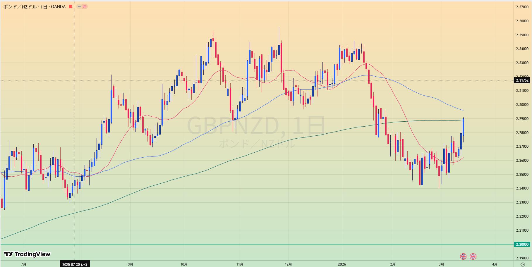 • レジラインを抜け2.2水平線でレジサポ転換でやや上昇優位2.20リテスト待ち
