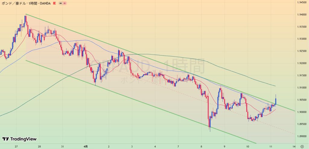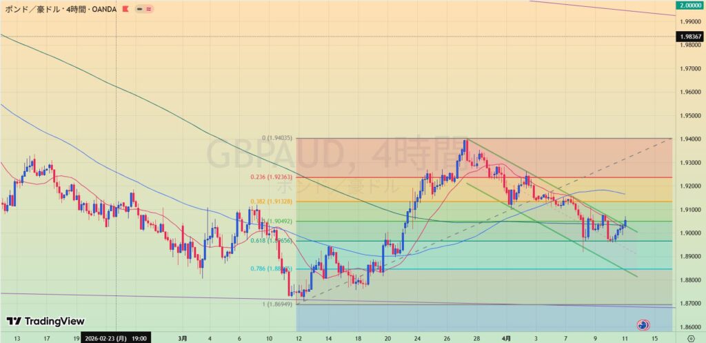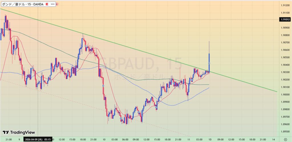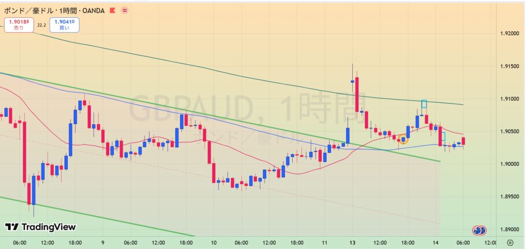 改善の余地: 1.904付近のロングに対し、すぐ上の1時間足200MA(緑の太線)が抵抗帯として機能するリスクをどこまで許容していたか。結果としてここで上値を抑えられたことが、伸びきれなかった直接的な要因である。
