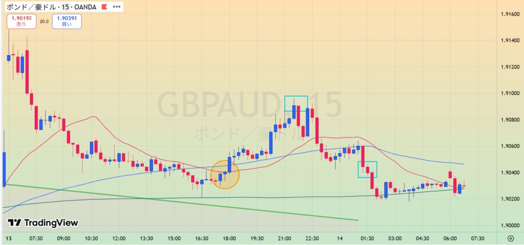 良かった点: ヨコヨコ推移からの「下髭ピンバー確定」をトリガーにした点。オレンジ丸の箇所は、チャネル上限ライン(緑)と15分足のMA群が収束し、反発の根拠が重なる「コンフルエンス」が発生している。