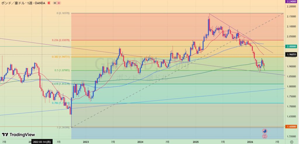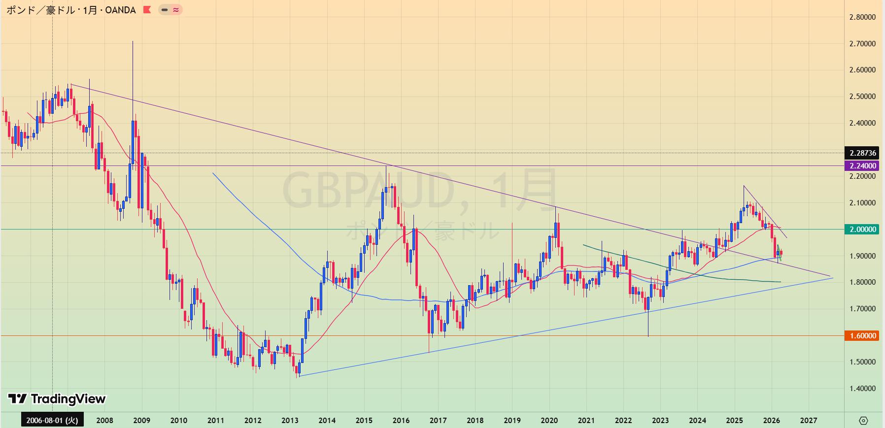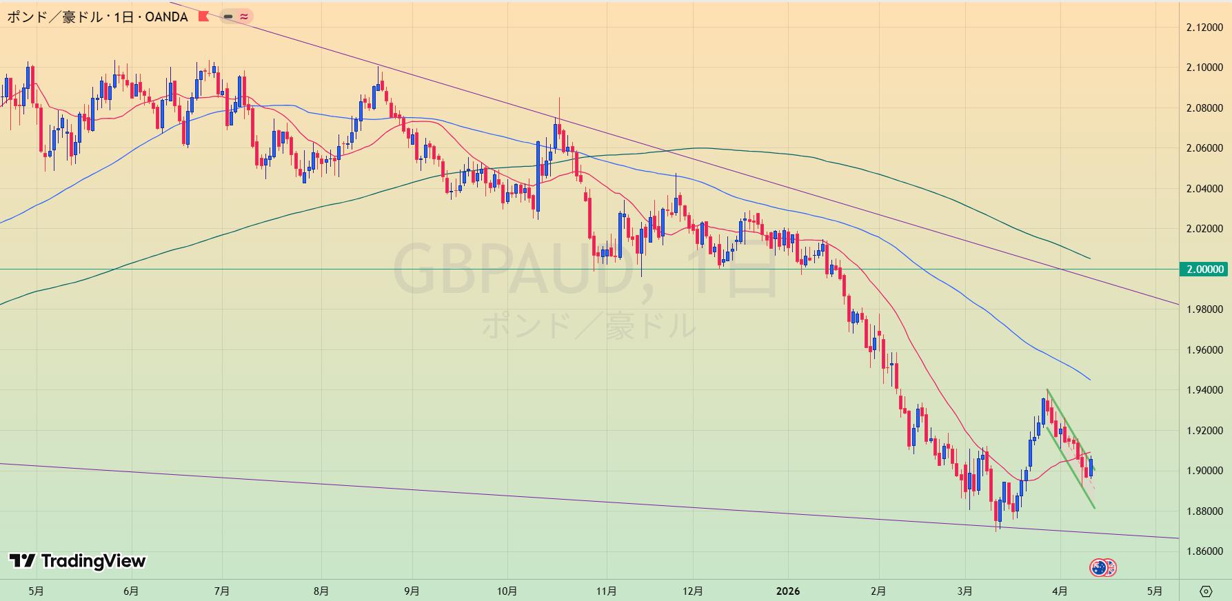 良かった点: 長期レジスタンスライン(2.000付近)を一度上抜けた後の「押し」を捉えている点。安値切り上げの構造を正しく認識している。