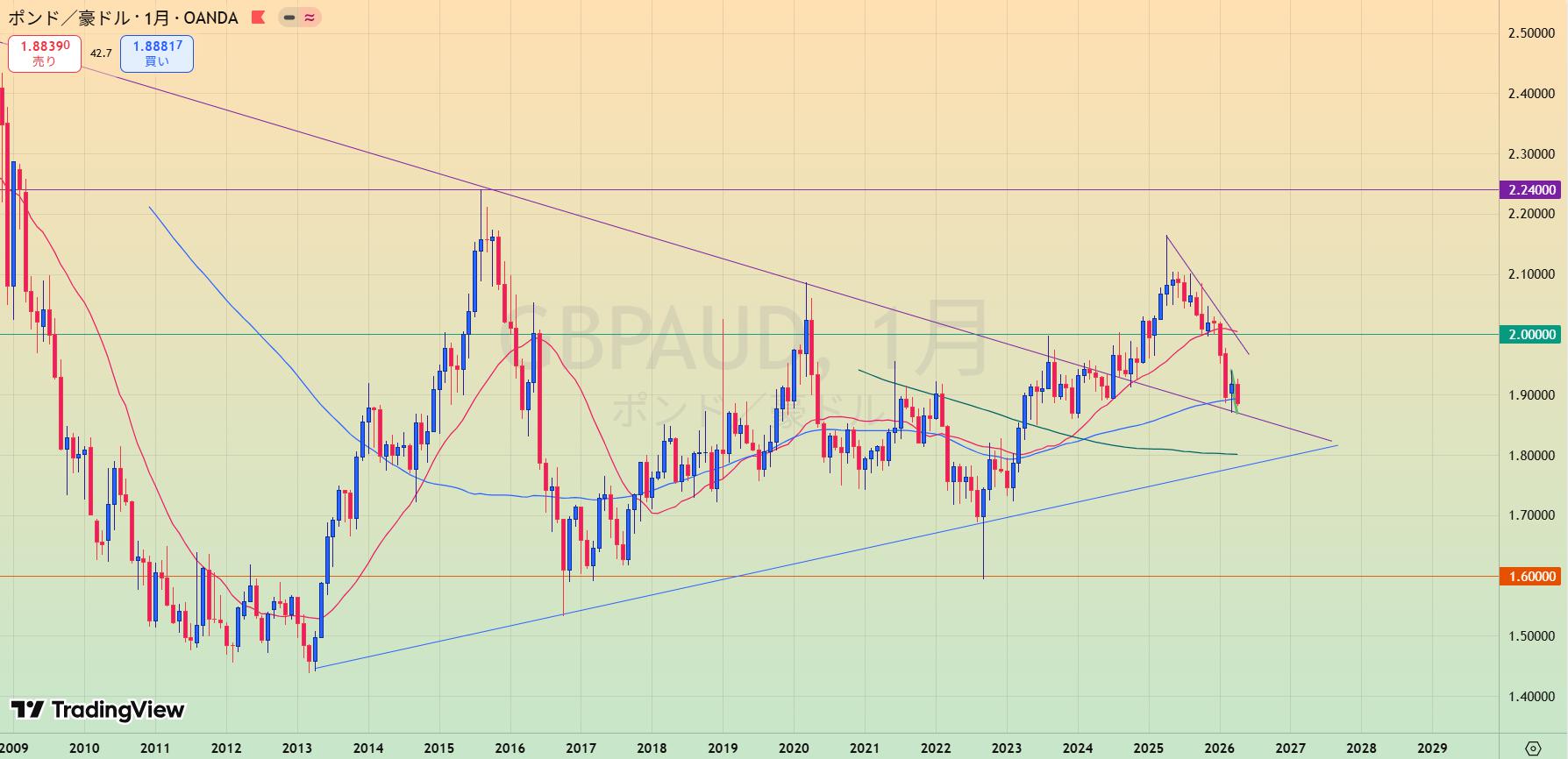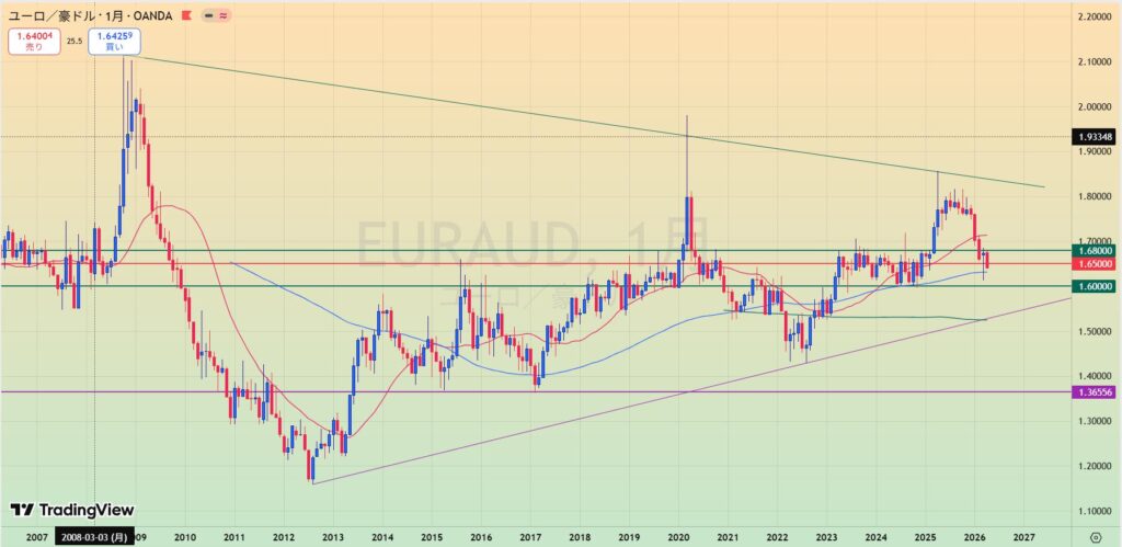 - 日足レベルでは下降トレンドなので、月足レベルレジラインを下抜けるようだと、考えていた展開とは違うということなので見送り。