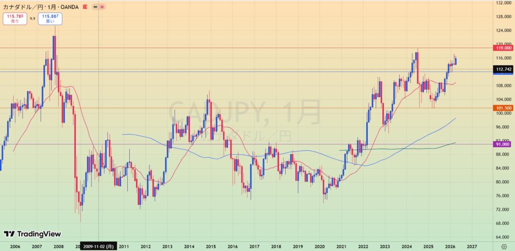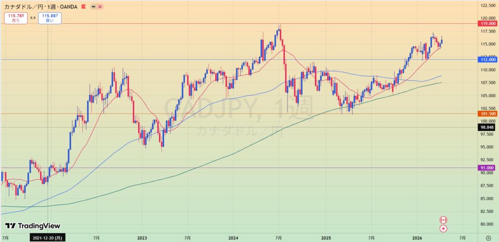 - 119を超えれば上昇トレンド継続だが、MA乖離大きく。