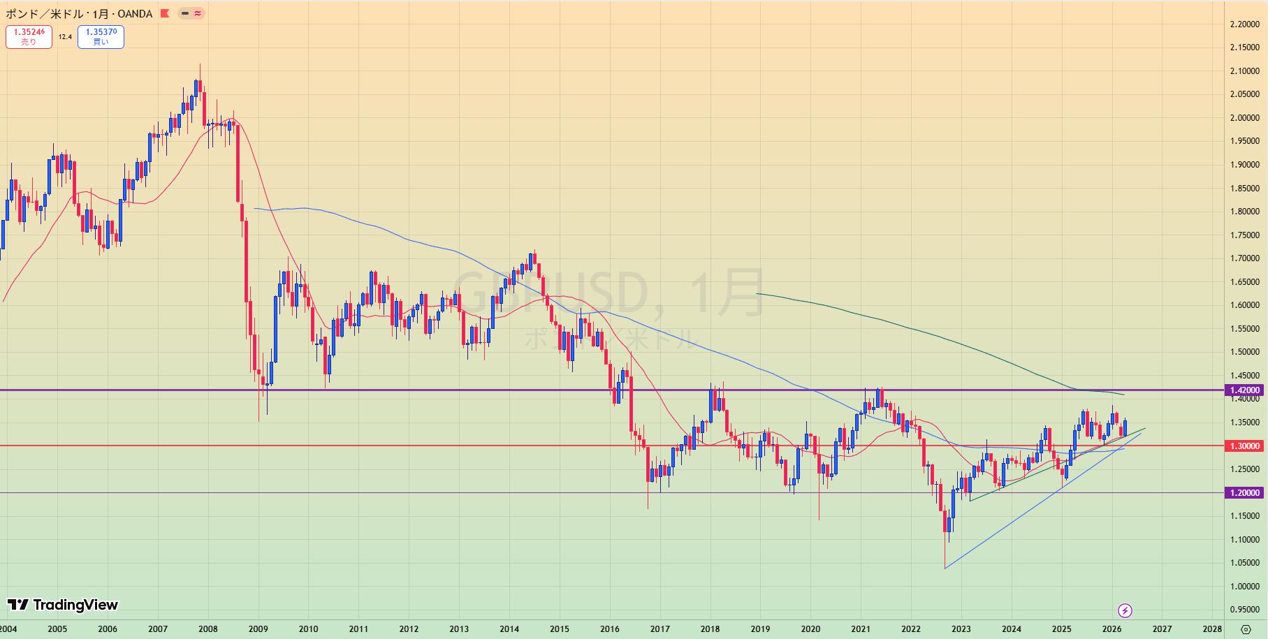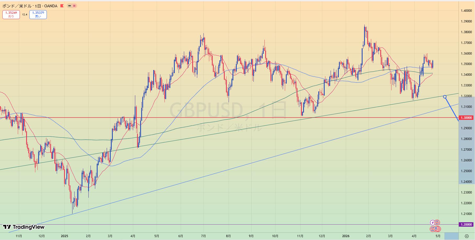 「逆三尊」の可能性: 週足レベルで見ると、1.30付近での反発に成功した場合、2022年末の安値を起点とした大きな右肩上がりの構造(逆三尊の右肩形成)になる可能性がある。売り一辺倒ではなく、1.30での強い反発サインが出た場合の「見送り」または「ドテン」の柔軟性が必要。