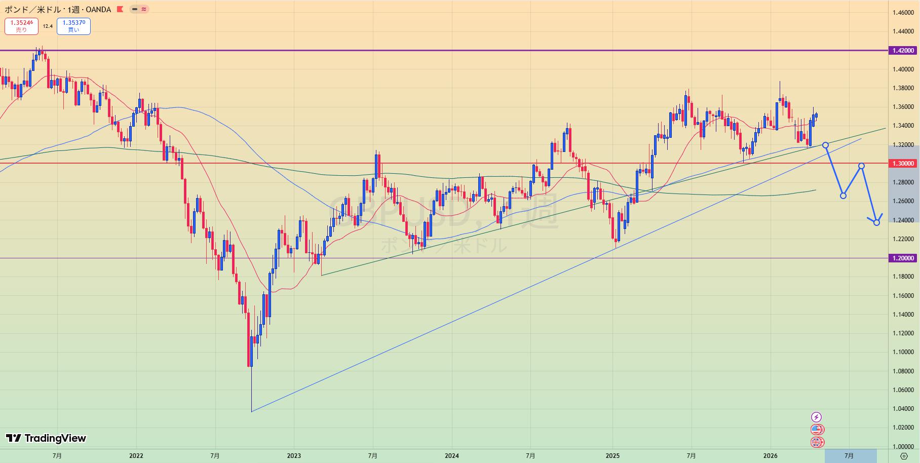 批判的視点: 1.30を抜けた後のターゲットを1.20としているが、その手前の1.25付近に前回安値(2025年序盤)が存在する。1.20への到達を確実視しすぎると、1.25での反発による利確の遅れを招く懸念がある。また、**「1.30で反発して上昇トレンドを継続させる勢力」**の存在を軽視していないか。ここは押し目買いの絶好ポイントでもある。