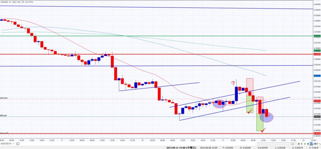 チャネル上限・下限での試し玉、さらに日足水平線をマグネットと認識した点はロジカル。