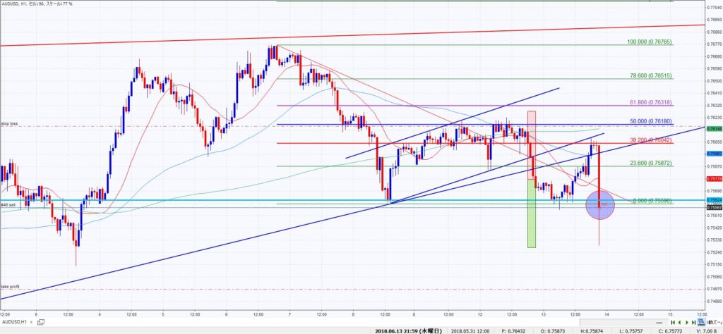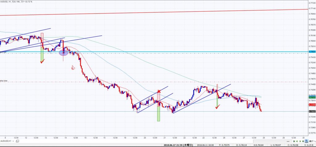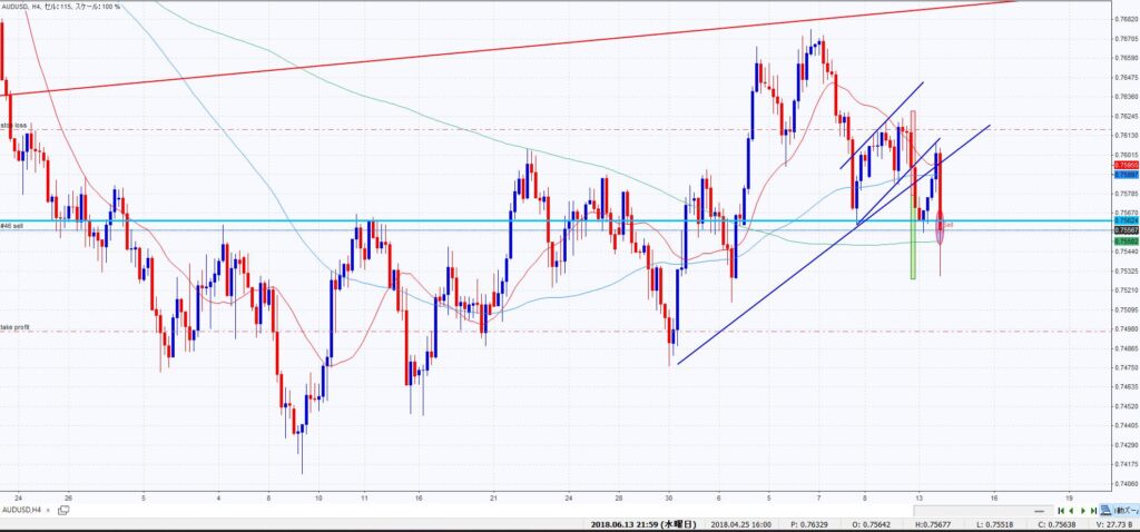 - チャネル抜けリテスト後宵の明星形成、少し伸びすぎた感じもしないでもないが、それでも下値余地は大きいこともありショートエントリー
