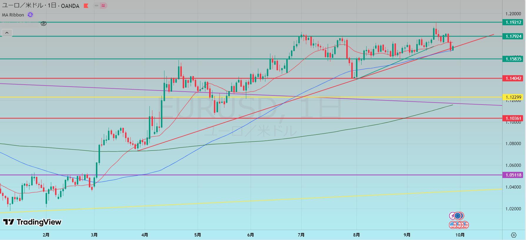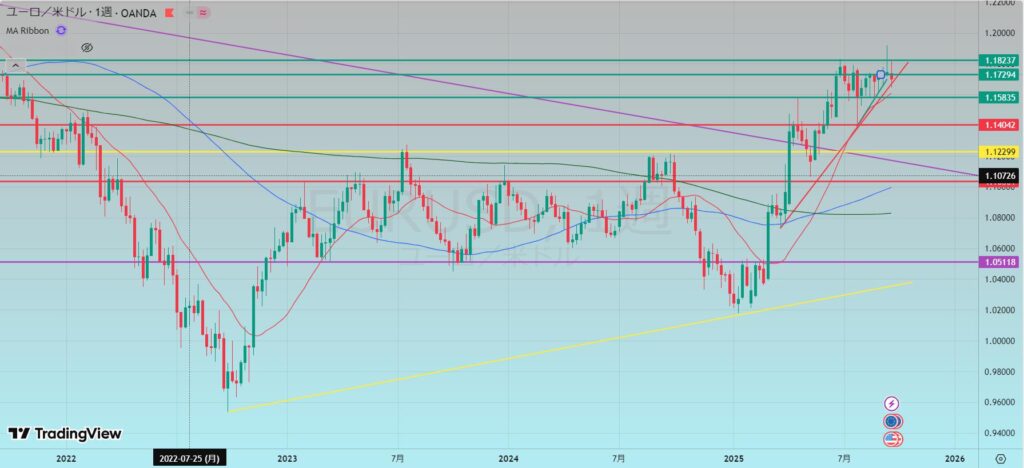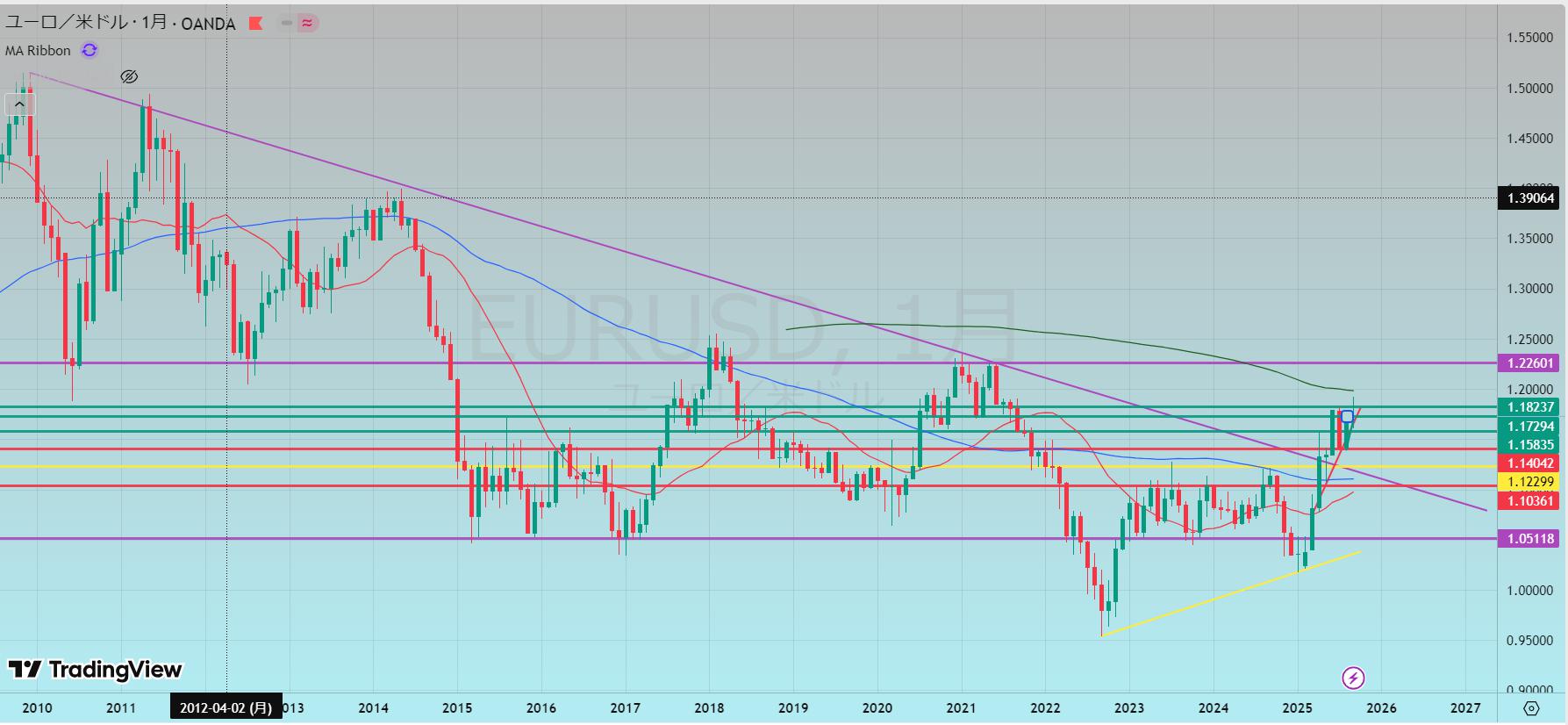 - 上記から調整があるとしたら赤の水平線のどちらか、MA200辺り