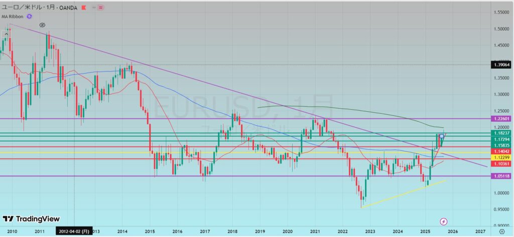 - ただ、4回反応したレジラインを抜けた所で、月足以下では短期的に上昇優位