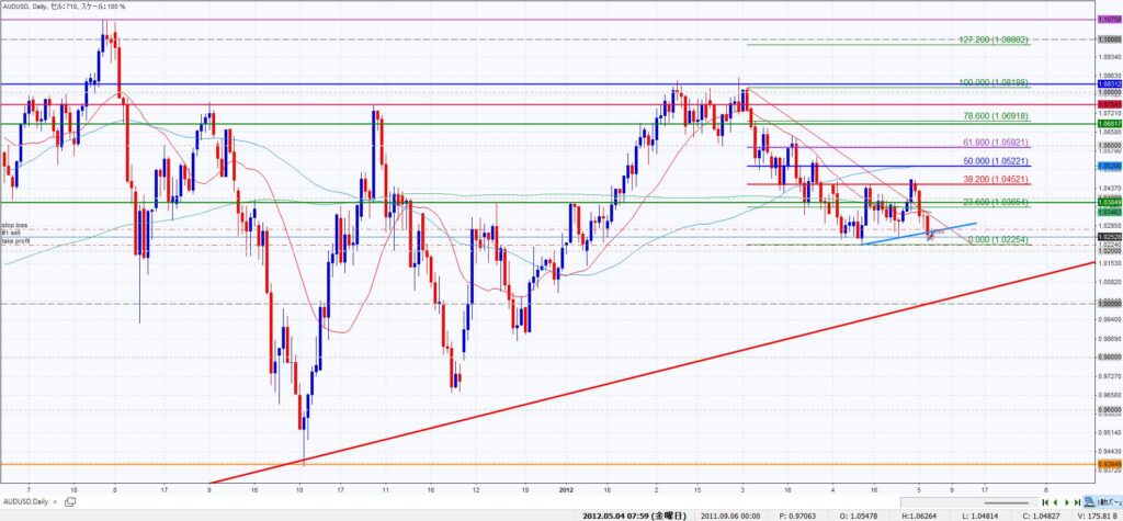 日足でWトップからの下落を確認し、直近のレンジ下限(赤ライン)までを明確な目標に設定している点は非常に的確。