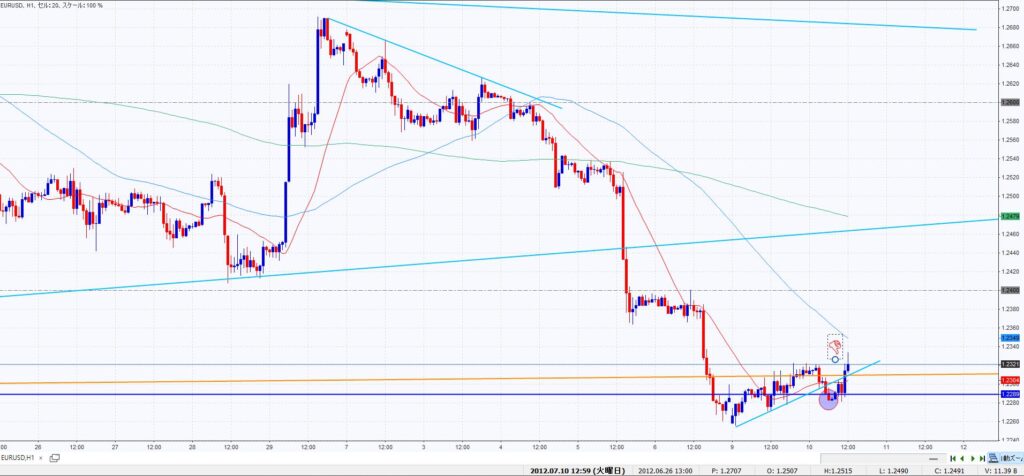 - ラインブレイクでじわじわスルスル下げが理想的で、その可能性もあるパターンだが、同時に押し戻りが不十分、という結果になることももちろんある。