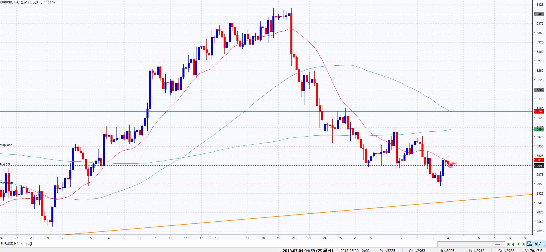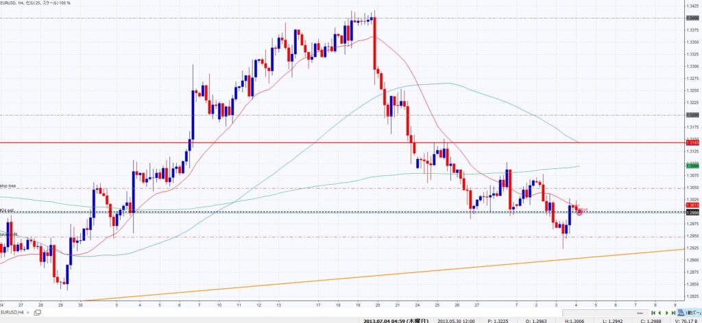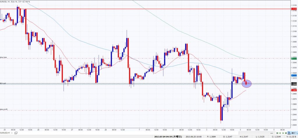 - ラインを超えた所で細かい足の続く迷い足の状態から陽線、それを包んでさらに下に抜ける陰線、次の足で1.3を下抜く陰線確定でショートエントリー