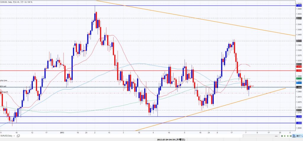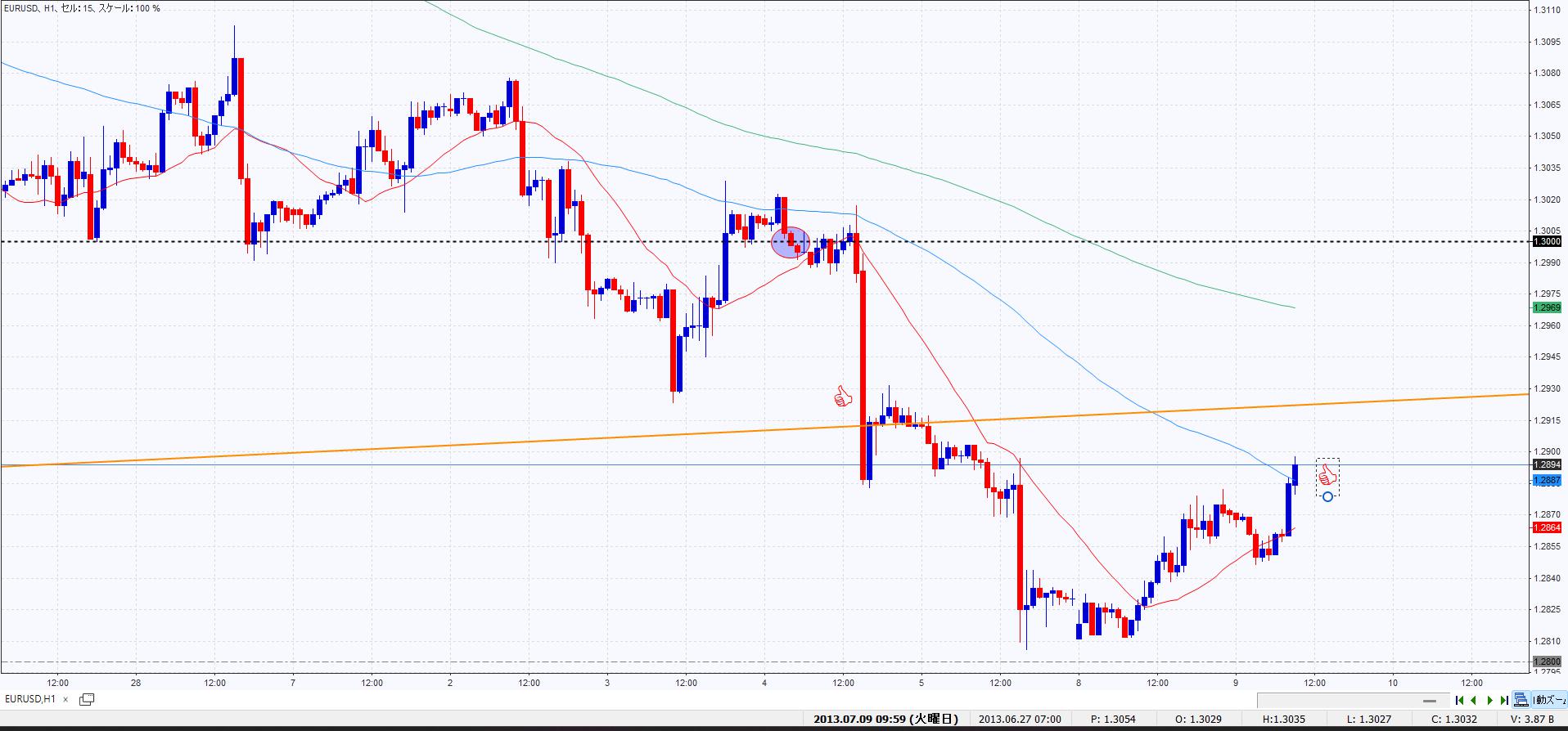 - 1.3の桁の大きなラウンドナンバーをレジサポに下抜け、リテストした場面