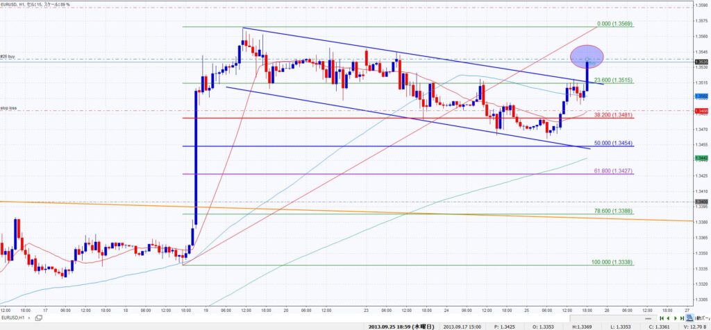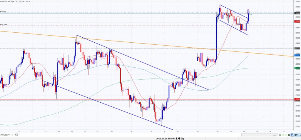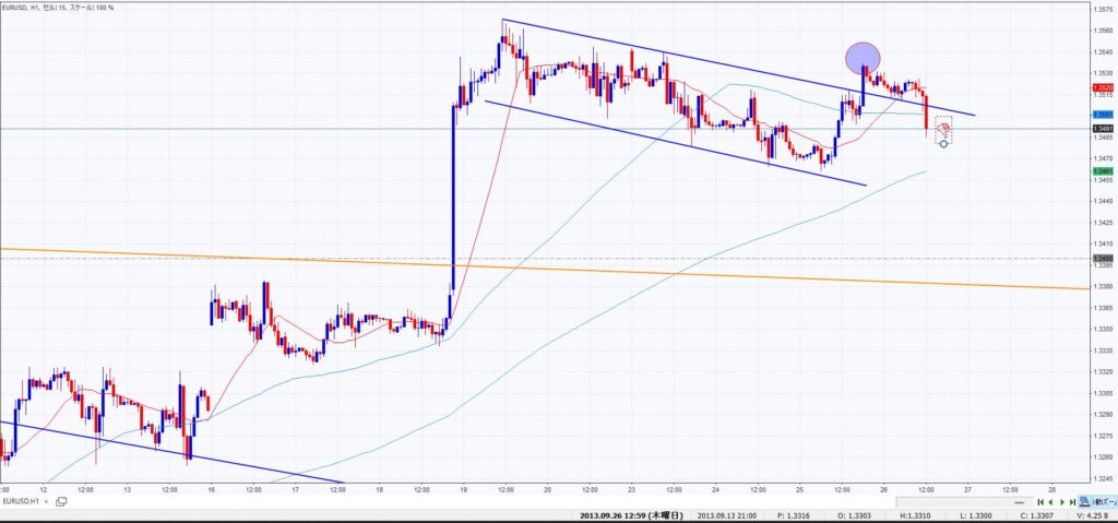 1Hの下降チャネル(フラッグ)が綺麗で、複数回下限→上限をタッチ。