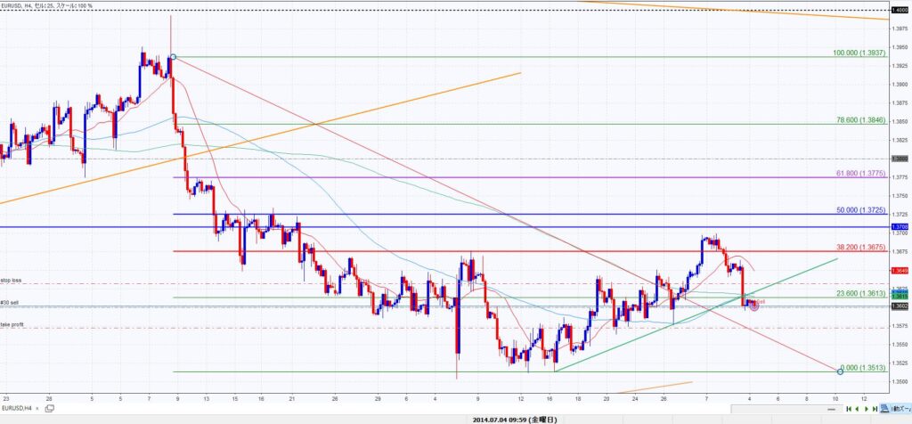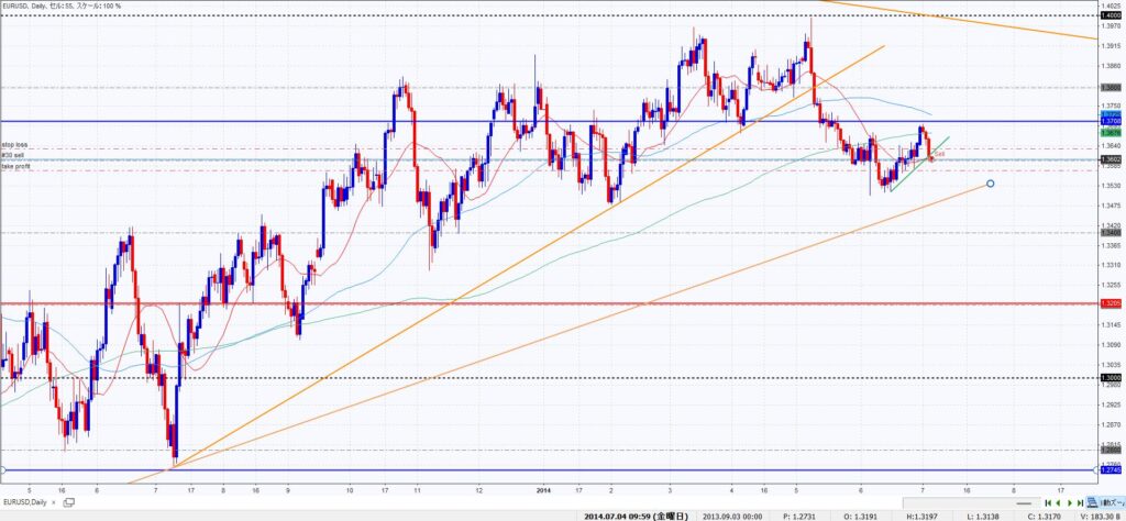 - 週足では方向感なく、日足で上昇トレンドが崩れた所