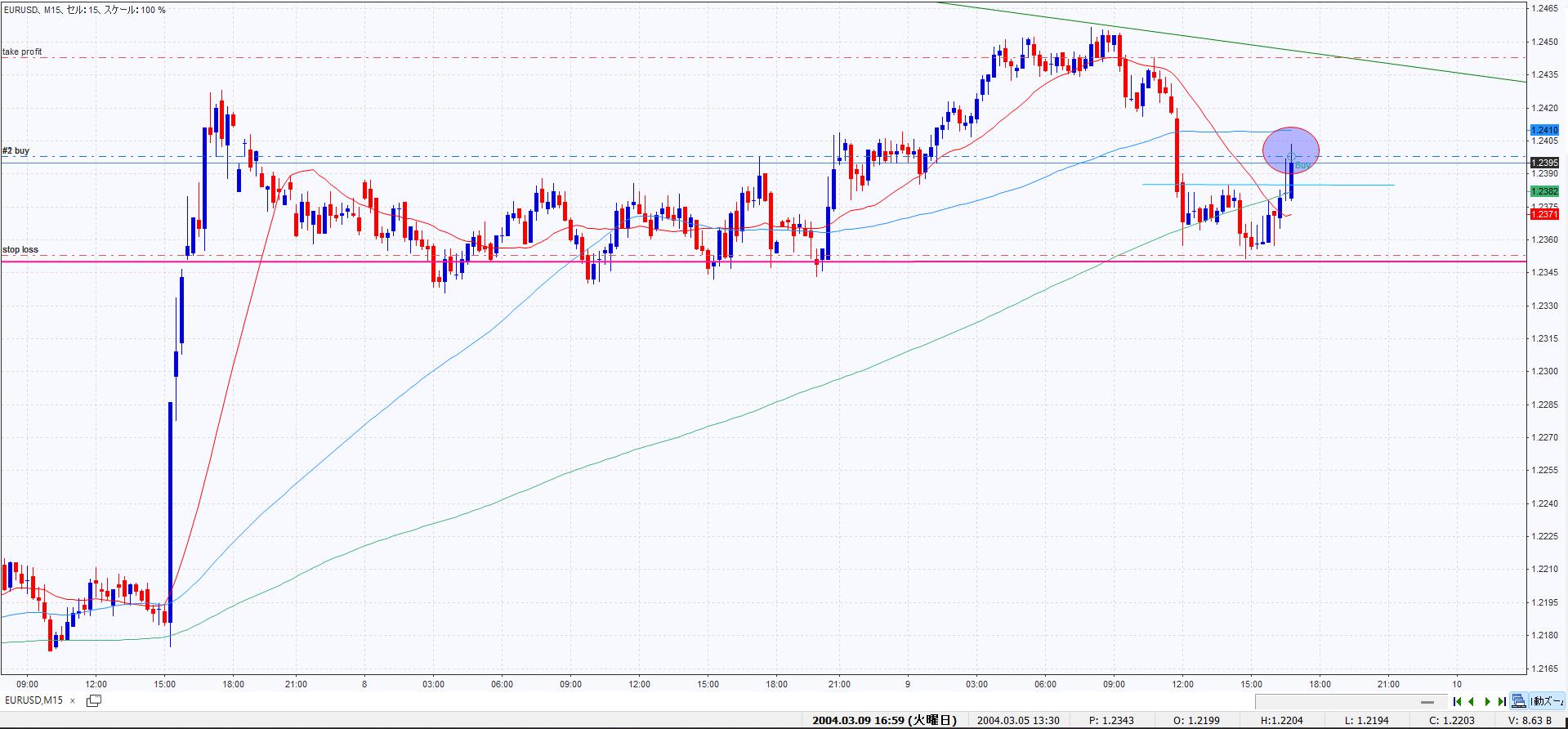 4.jpgにて、下降トレンドライン(緑)までの空間(約45pips)を「賞味期限」と定義した点は非常にスマートです。