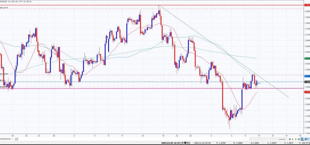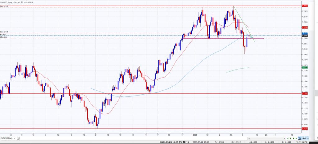- レジラインを抜け、引き直したレジライン(緑)まで(45P)が直近の目標。抜けるようならついていく、ここで反転なら建値撤退の作戦