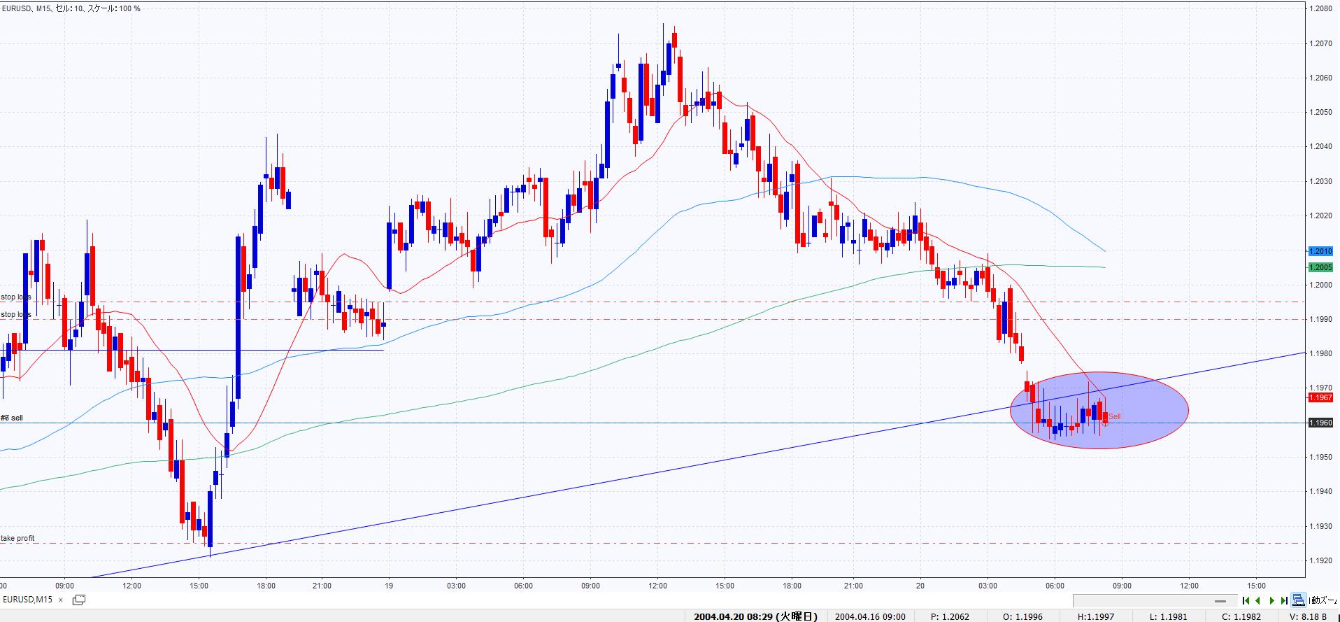 ラインをピンバーで試し、陽線、その後陰線抱き足の後、陰線ピンバーでショートエントリー
