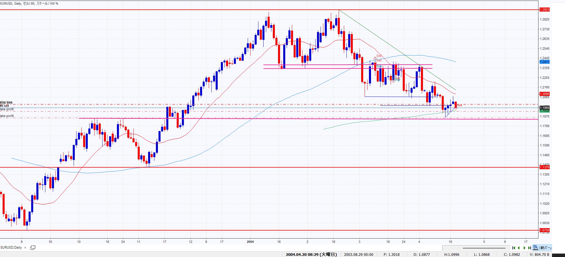 - 100P辺りに日足レベル水平線。これを超えると伸びる場所だが、検証なのでここで。