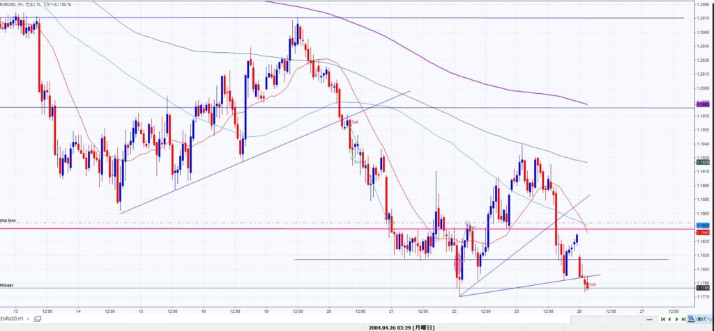 • 根拠となるラインの起点の見極めが甘かったか?日足・4Hではノイズにかられた感じだが、1Hで見ると赤の水平線を超えると根拠がなくなる感じ。