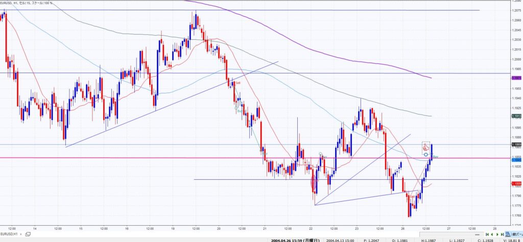 • H1で見える赤の水平線を超えた時点で、ショートのシナリオは完全に崩壊していました。